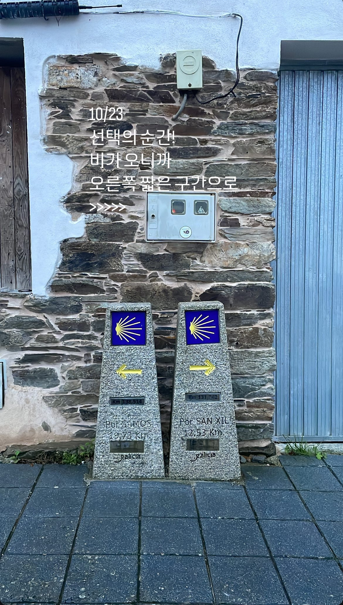 오른쪽 길도 아름다웠지만, 나는 안개가 자욱한 산길을 따라 가파른 오르막을 오르고 싶지는 않았다. 대부분의 순례자들이 빠른 길을 택해 오른쪽으로 향했지만, 나는 발걸음을 멈추고 방향을 돌렸다. 이제부터는 나만의 속도로, 조금 더 고요한 길을 걸어가기로 결심했다.