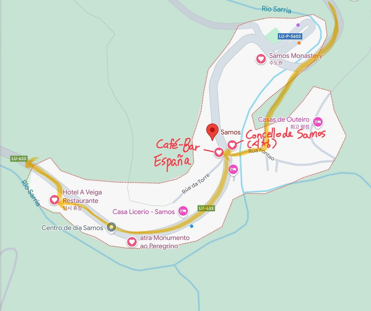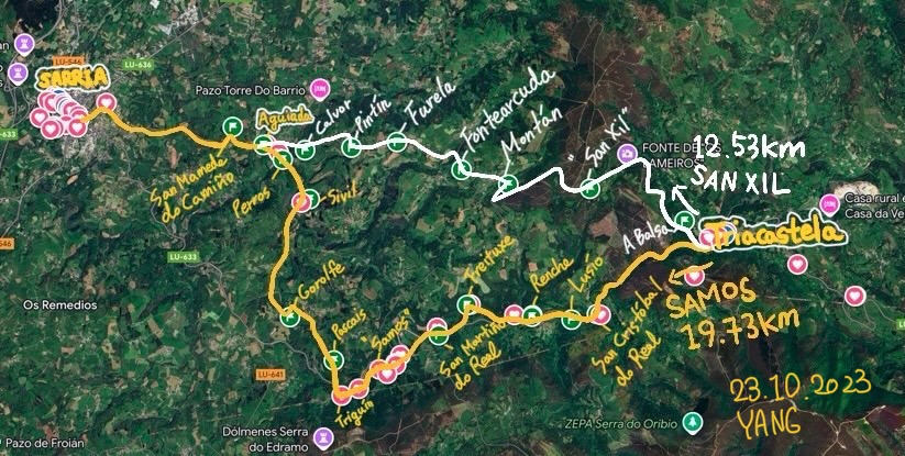 Triacastela> San Crisovo do Real(Por Samos) 3.8km> Renche(Por Samos) 4.4km > Lastres(Via Samos) 4.4km > Renche(Via Samos) 5.5km> Freituxe(Via Samos) 7.2km > San Matiño do Real(por Samos) 8.3km> Samos 10.1km > Pascais(Via Samos) 13.4km > Gorolfe(Por Samos) 15.3km > Sivil(Por Samos) 18.6km > Perros(Por Samos) 20.6km > Aguiada (길이 합쳐지는 지점) 20.6km > San Mamede(O Camino) 21.8km > Sarria25.5 km