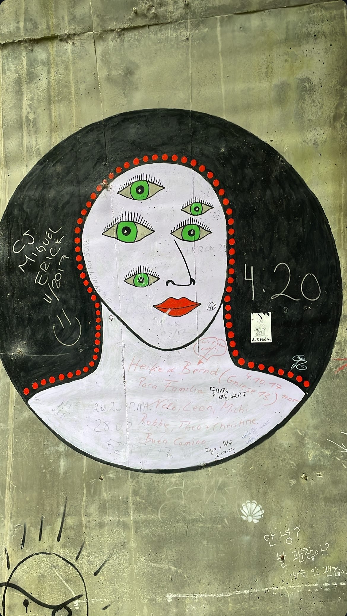 이 굴다리를 지나니, 다리 아래에는 한 그라피티 아티스트의 제3의 눈이 그려진 작품이 눈에 띄었다. 그렇게 길을 걷다 보니, 129.8km가 남았다는 순례길 비석이 나타났다.