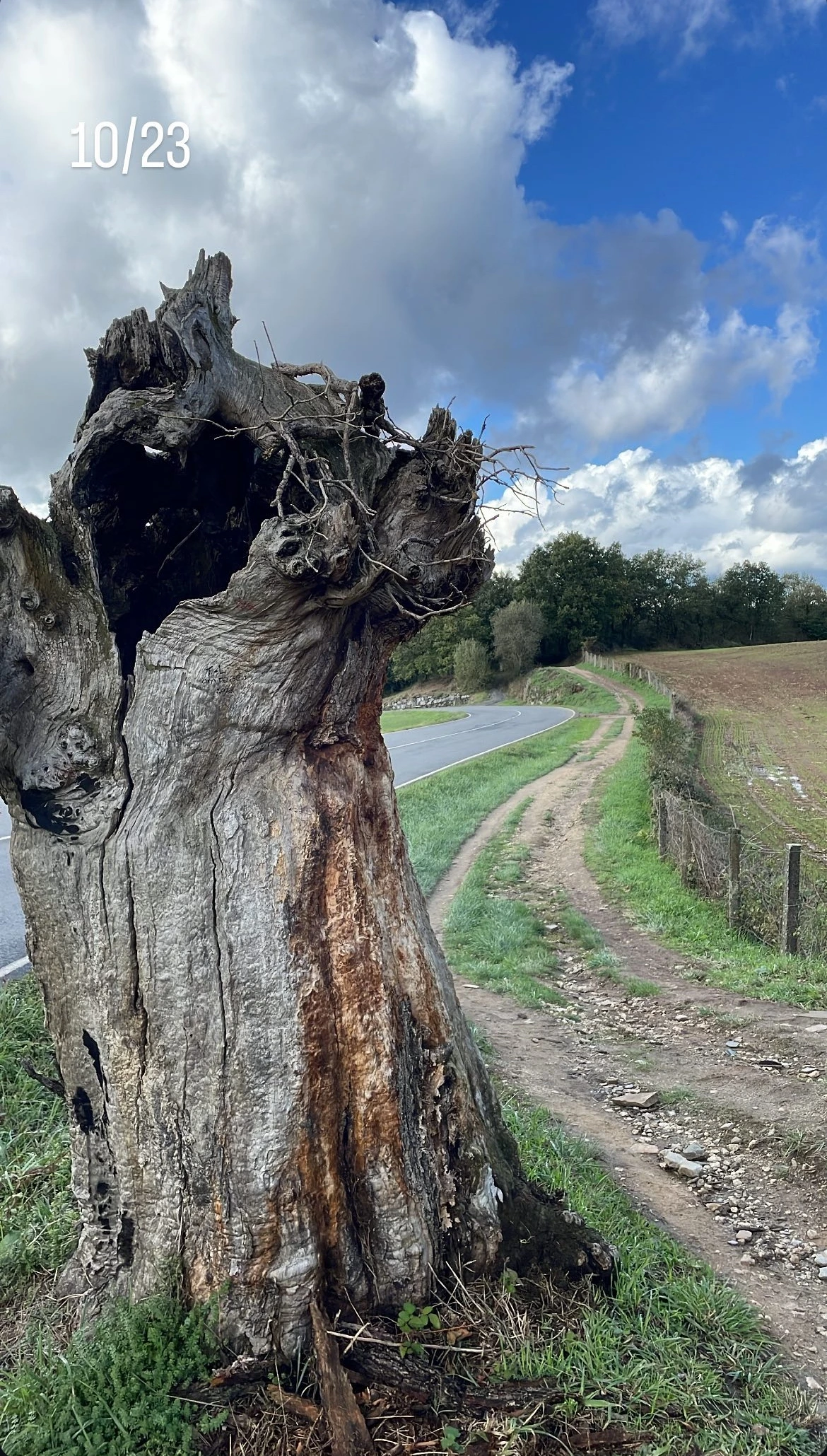사리아로 가는 길에 100년은 족히 되어 보이는 고목이 서 있었다. 번개를 맞은 건지, 윗둥이가 날아가고 구멍이 뚫려 있는 그대로 길 한복판에 서 있었다.