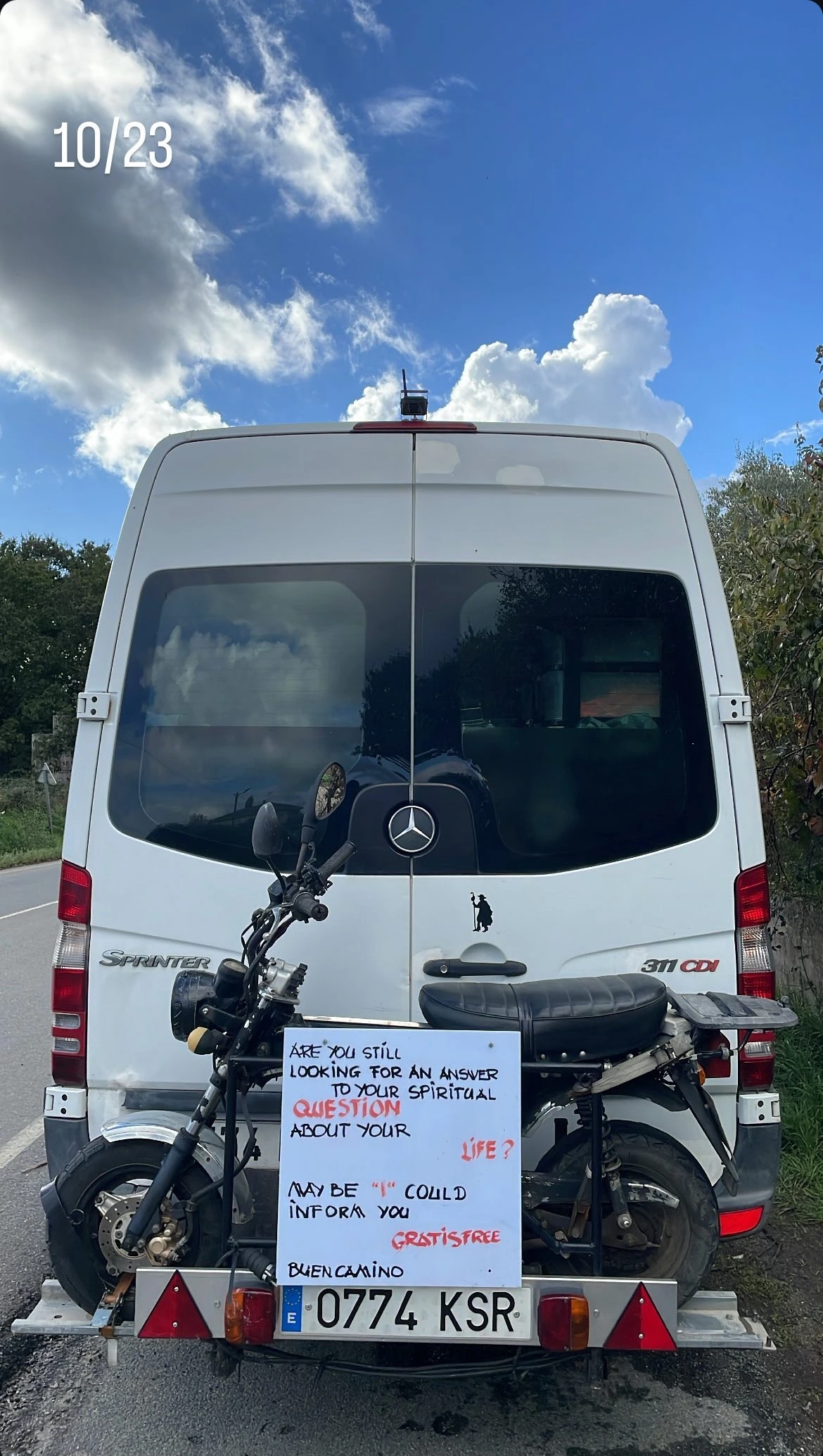 대형 캠핑카에 오토바이를 매달고 영어로 붙인 질문 표지판이 눈길을 끌었다.