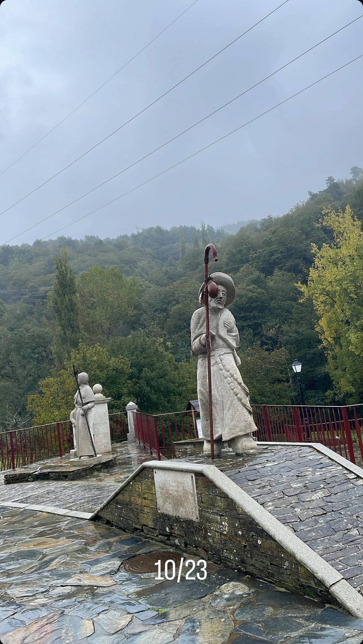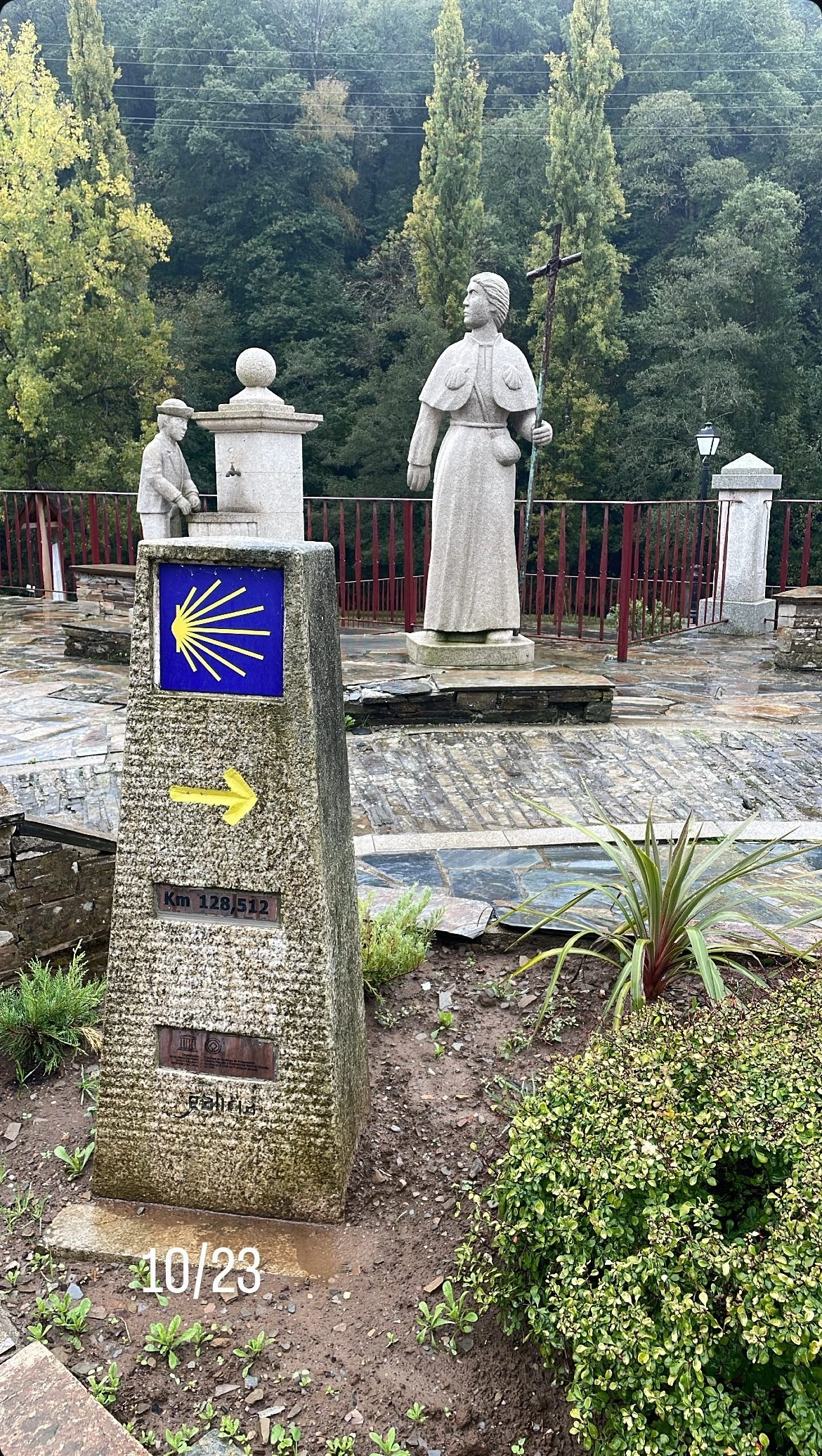 순례자들끼리 가벼운 눈인사를 나눈 뒤 길을 덧나가다 보니, Atra Monumento ao Peregrino 순례자 석상이 비를 맞으며 길 위에서 순례길을 안내하고 있었다.