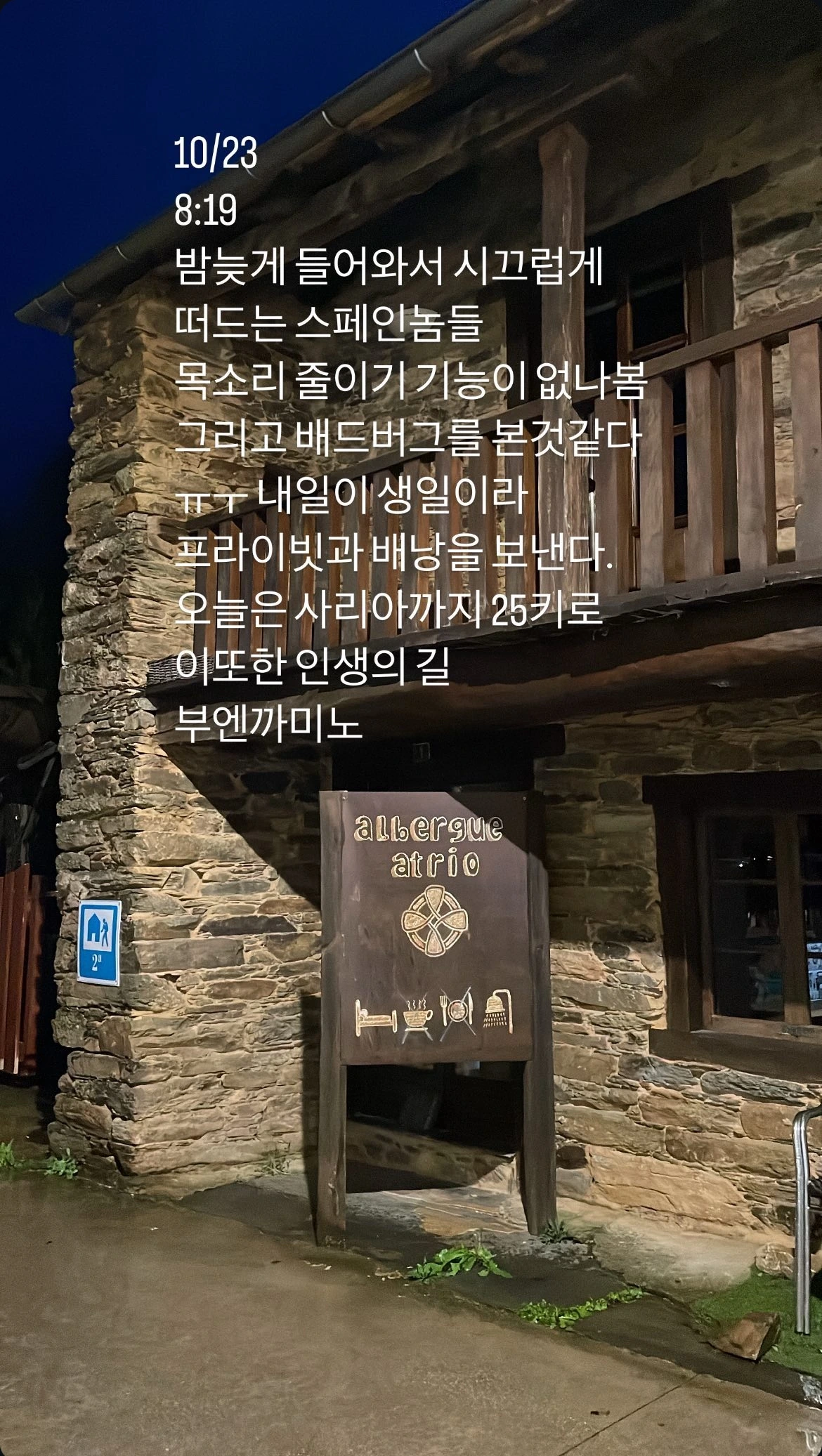 트리아카스텔라의 밤은 순례길에서 보낸 밤 중 가장 나를 시험에 들게 한 순간이었다. 계속되는 궂은 날씨와 추위는 쉽게 지치게 만들었다. 하지만 사리아에 도착하면 생일을 기념해 하루 더 쉬기로 했고, 1인실 숙소도 예약해 두었기에 버틸 수 있었다.