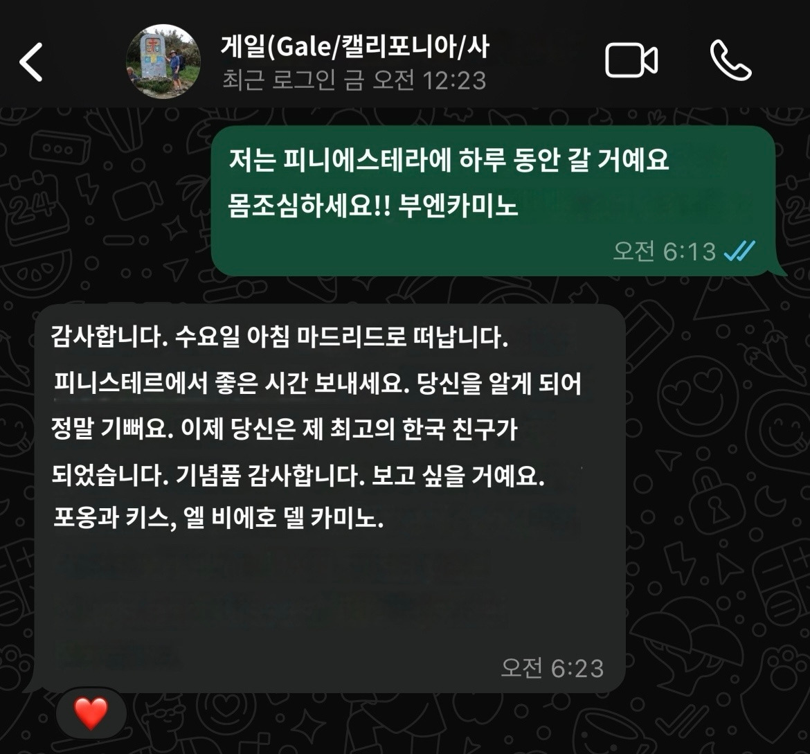 마리아의 걷기에 대한 열정과 체력은 정말 대단하다는 생각이 들었다. 우리의 여정이 끝나가고 있는 이 시점에, 누군가는 다시 길 위에 오른다는 사실이 묘하게 뭉클하게 다가왔다.
