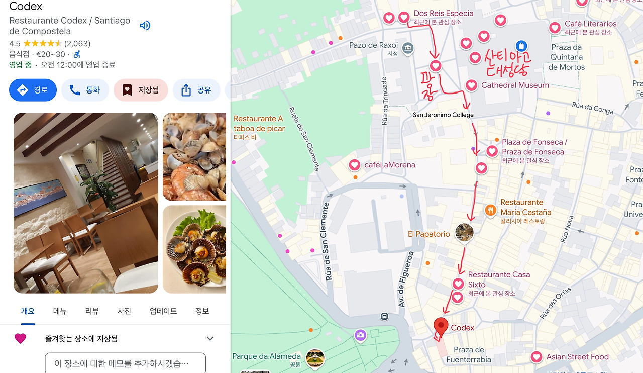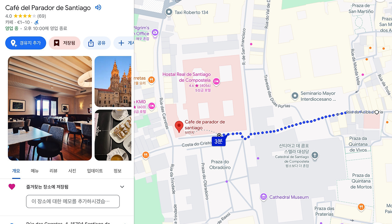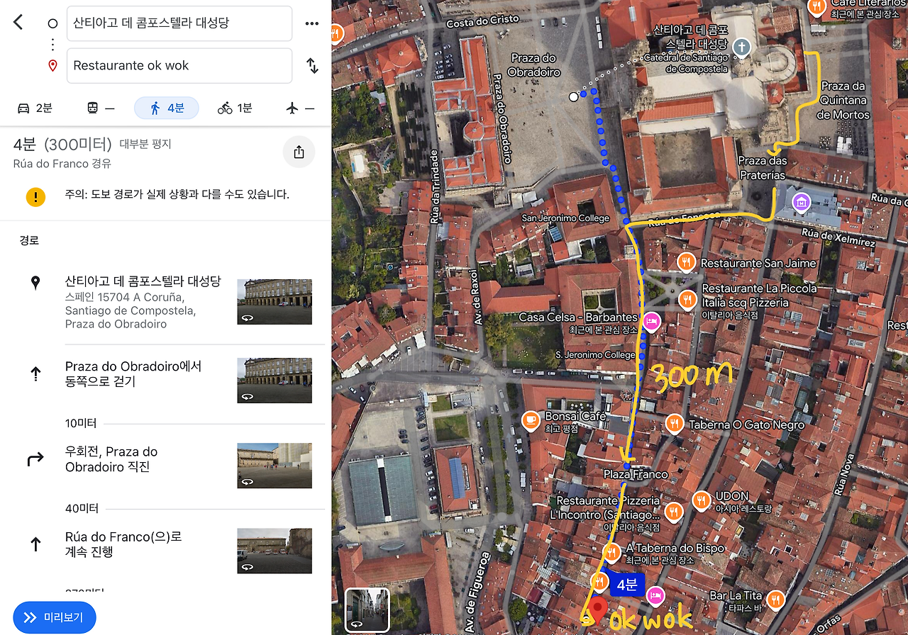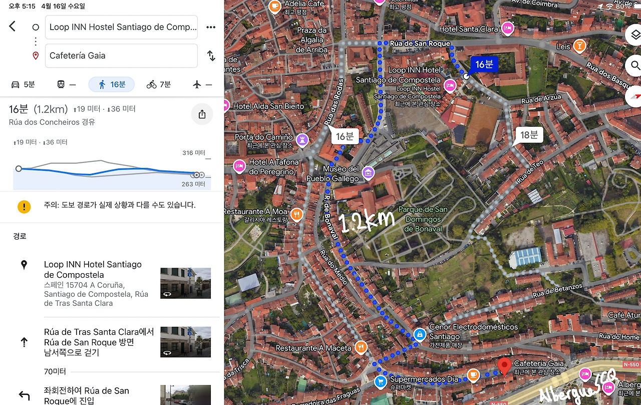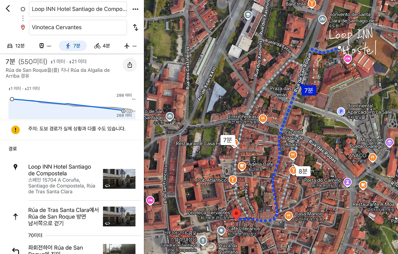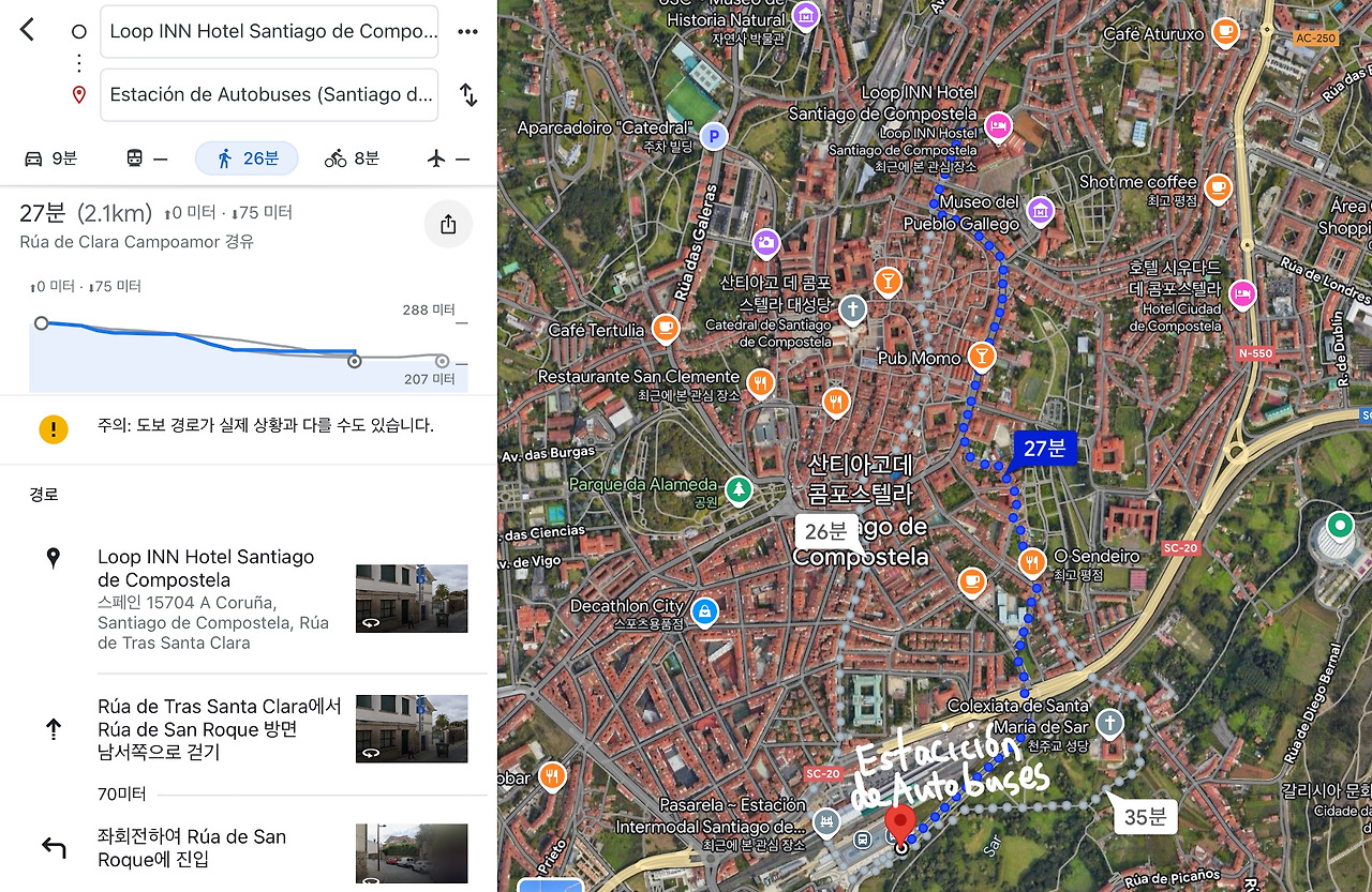 구글에서는 2.4km만 걸으면 된다고 안내하고 있었다. 나쁘지 않은 거리였다. 오늘은 로닛의 숙소가 있는 위쪽 거리와 버스, 기차역이 있는 아래쪽 거리를 오가며 산티아고 데 콤포스텔라의 골목골목을 걸어 다녔다.