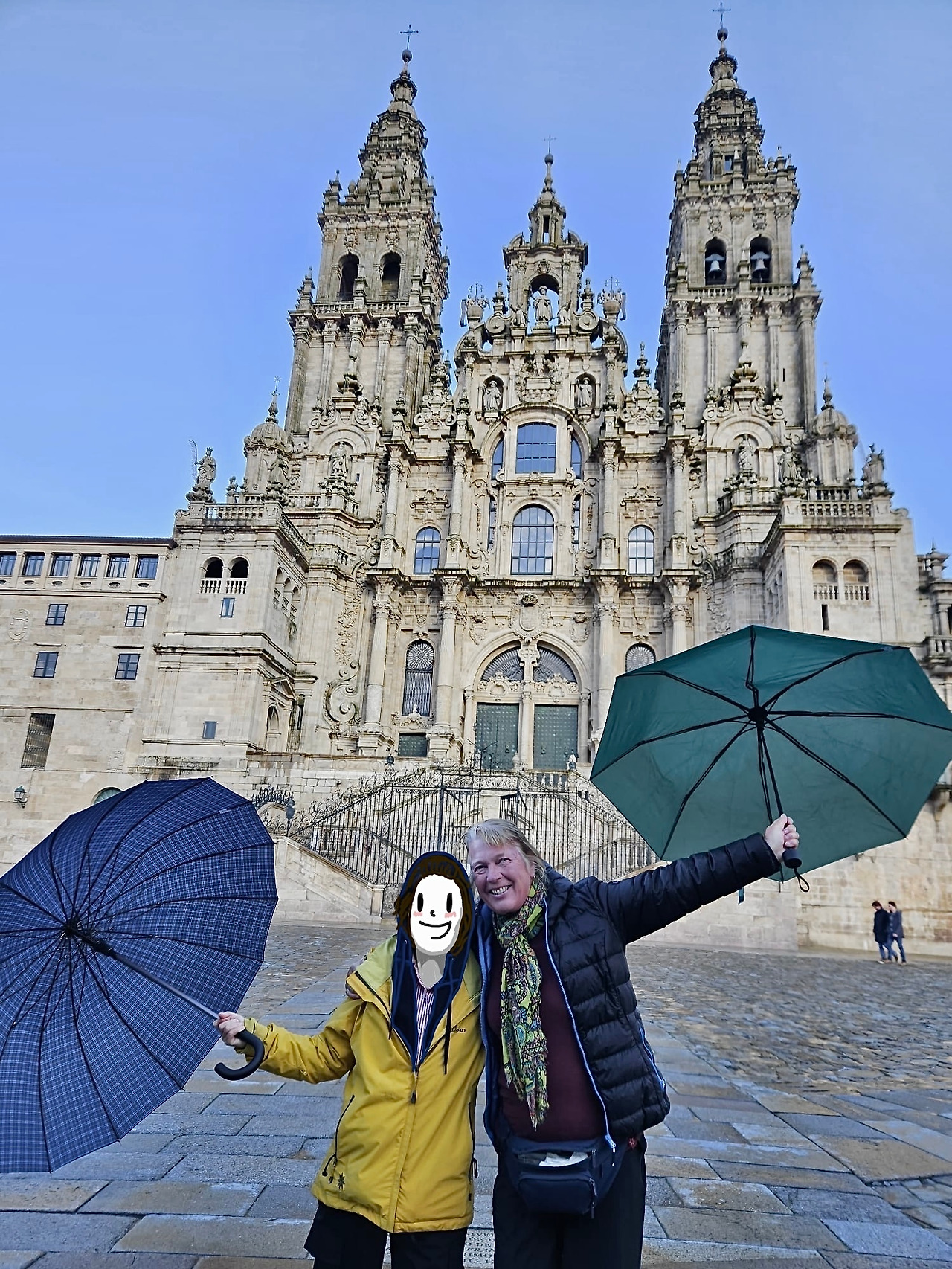 10월 30일 오전까지는 바람이 많이 불었지만 날이 맑아서 다행이었다. 순례자 사무소에서 완주 인증서를 받고 광장을 지나가던 안나와 우리는 극적으로 다시 만난 것에 즐겁고 반가워 함께 기념사진을 찍었다. 나와 안나는 우산을 펼쳐서 양팔을 벌리고 인증사진을 찍었는데, 바람이 심하게 불어서 우산이 저 멀리 날아가 버렸다. 진짜 내가 날아가는 줄 알았다. 안나와 이렇게 다시 함께할 수 있다니 정말 행운이었다.