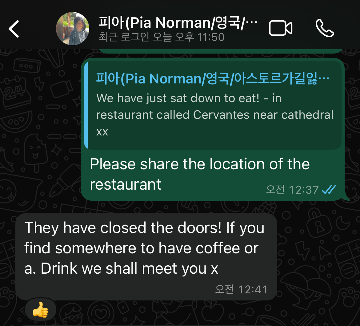 피아는 문이 열려 있는 다른 장소를 찾으면 그곳에서 커피나 차를 마시자고 연락이 왔다.