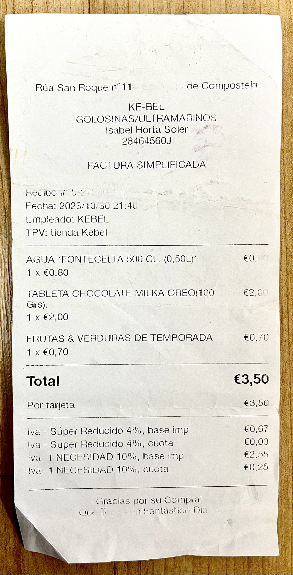 내일은 이른 출발이기에, 숙소 근처 슈퍼마켓에서 물과 초콜릿, 그리고 아침에 먹을 약간의 과일을 샀다. 익숙해진 산티아고의 구불구불한 골목을 따라 천천히 걸어 숙소에 도착했다.