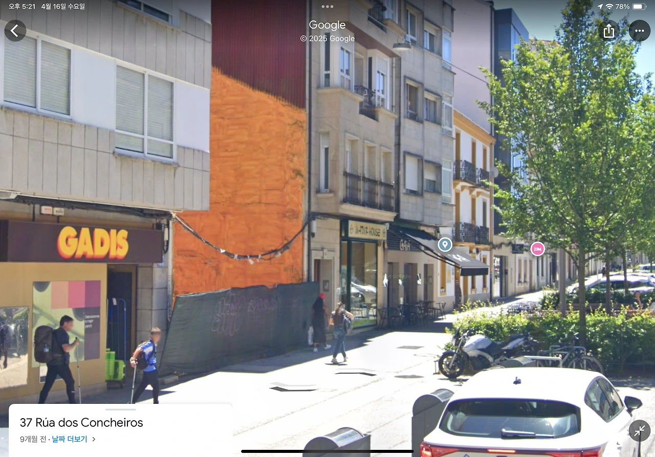 순례사무소나 대성당을 가기 위해 가던 길과는 다른 산티아고 뒤쪽 초입길로 가야 했기에 구글 지도가 새로운 길을 안내했다. 덕분에 숙소 앞 풍경을 여유롭게 지켜볼 수 있었다. 하지만 현실의 유럽의 골목길은 길이 있다가도 사라지기를 반복하므로 생각보다 시간이 더 걸렸다.