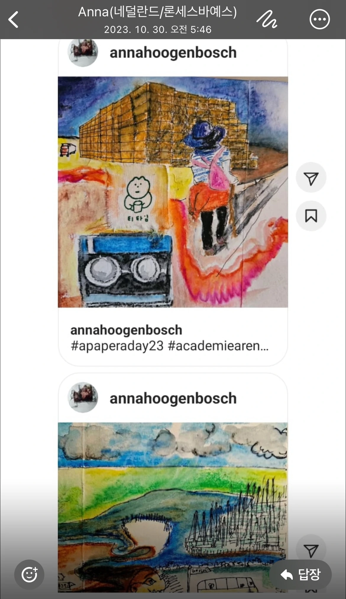 안나는 늘 가지고 다니던 수제 드로잉 아코디언북을 꺼내, 여정 중 나를 그렸던 그림과 순례길을 영감 받아 그렸던 그림들을 피아에게 보여주었다. 우리의 여정은 그렇게 그림으로 남아, 아름다운 기록이 되어 있었다. 마리아는 아마도 아까 그 카페가 문이 잠겨 있어 들어오지 못했던 것 같다.