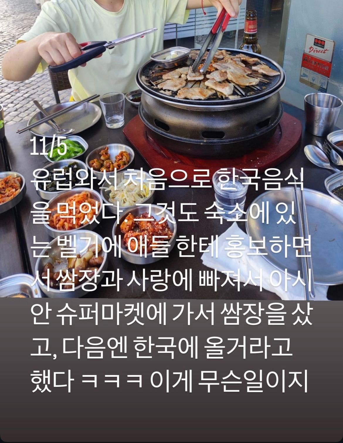 소주와 맥주를 섞어 먹는 문화와 가위로 고기를 적당히 잘라서 쌈에 구운 마늘과 쌈장을 찍어 고기와 함께 먹는 방법을 알려주었더니, 쌈장이 너무 맛있다며 정말 많이 찍어 먹었다.