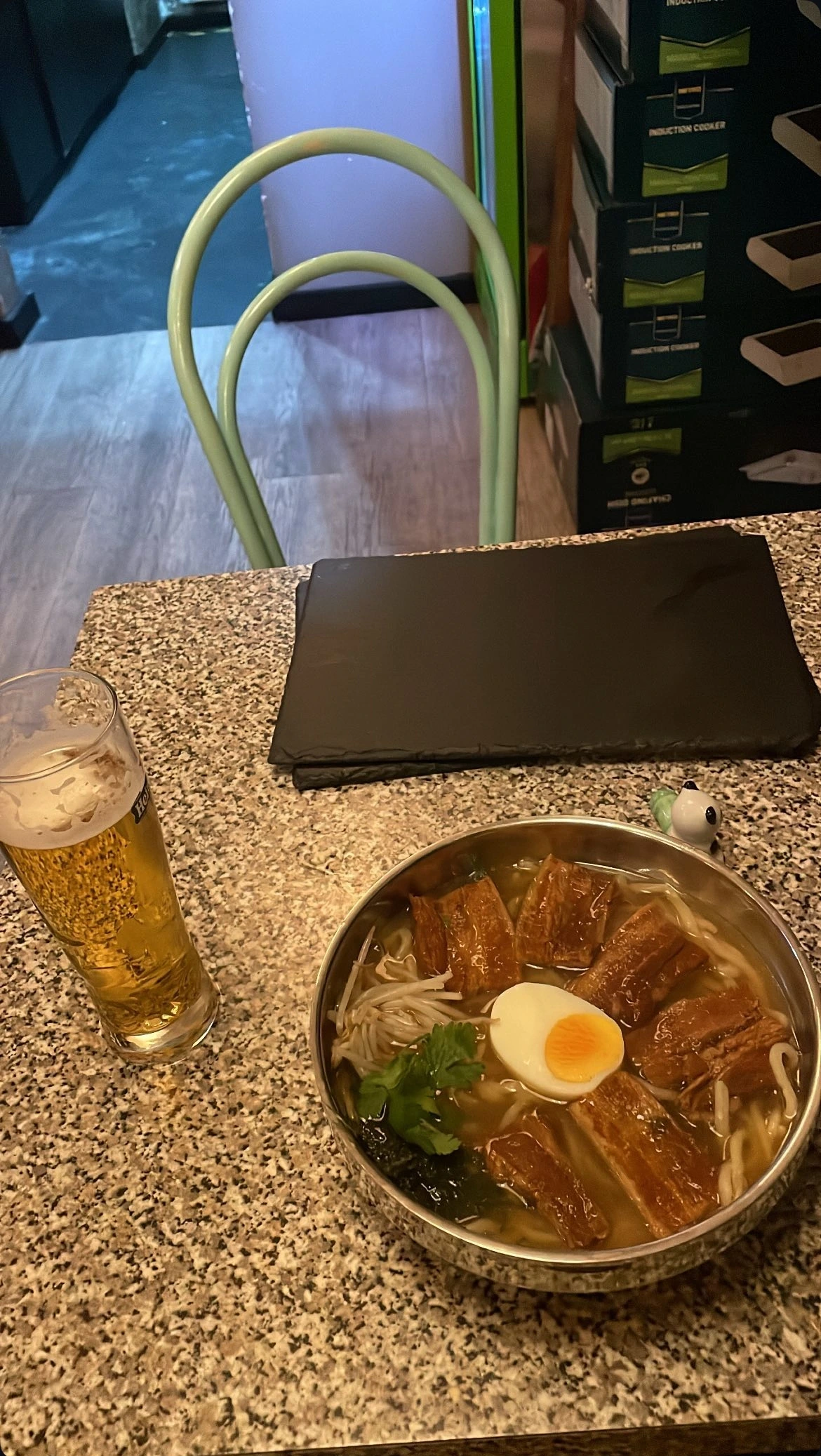나는 비 오는 날씨에 쌀쌀해진 기운 탓에 맥주와 돈코츠 라멘을 주문했다.