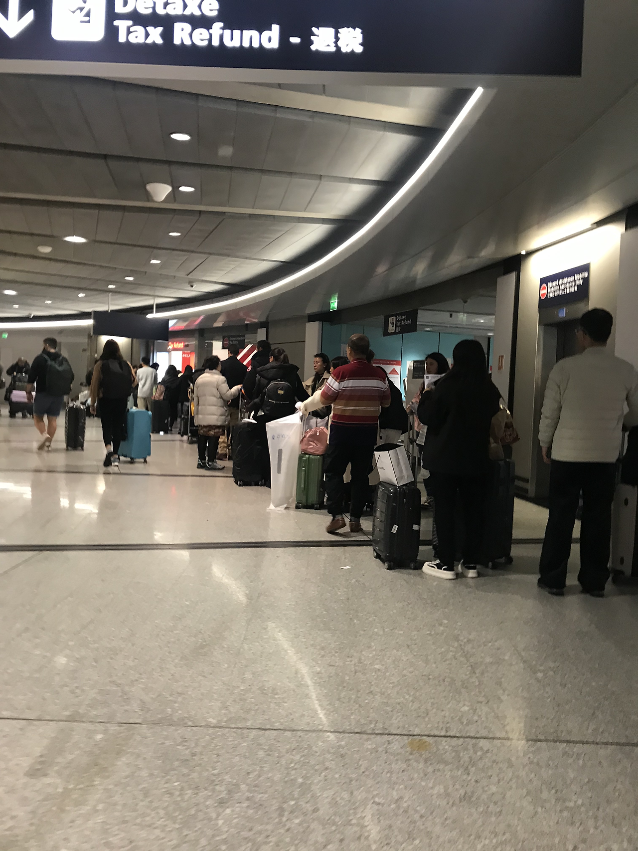 텍스 리펀 지그재그로 줄 서는 라인을 따라 짐 카트를 끌고 가는 길,