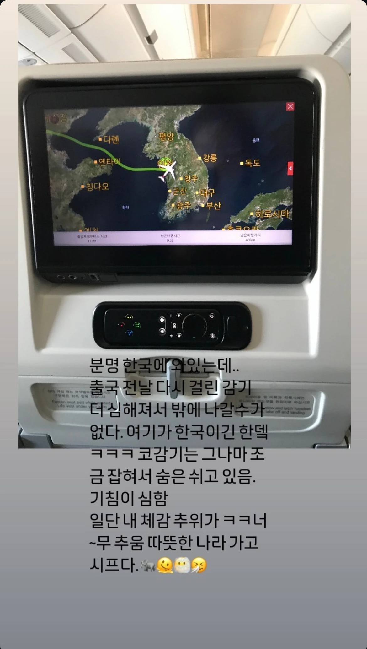 타이레놀을 과다하게 먹었음에도, 비행기 안의 탁한 공기를 내 목은 받아들이지 못했다.