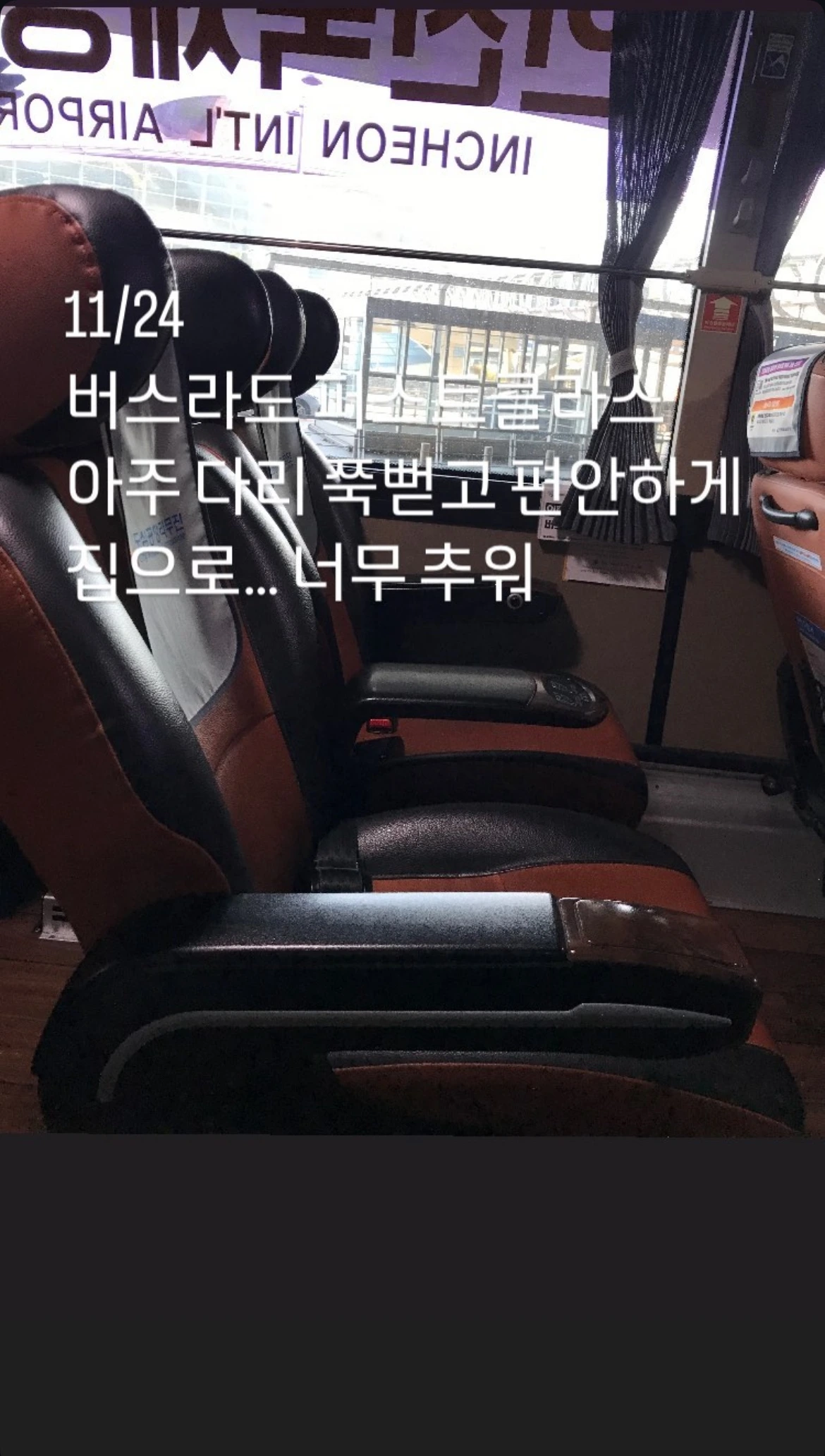 집으로 향하는 공항버스 안에서 드디어 10시간 넘게 꼼짝 못 하고 있던 발을 펴고 꿀잠을 잘 수 있었다.