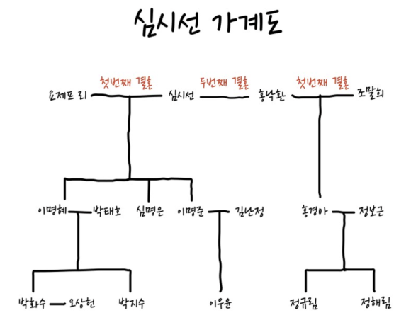 심시선을 중심으로 한 삼대가 나오다 보니 등장인물의 관계가 꽤나 복잡했다. 소설을 읽는 초반에는 앞 장에 수록된 이 가계도를 들춰보며 인물을 파악해야 했다. 각자의 개성이 뚜렷해 얼마 지나지 않아 저절로 살아 움직였다.