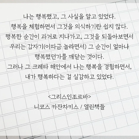 행복한 순간은 그 시간이 다시는 오지 않을거라는 것을 알기에 온 마음으로 기억해야 한다. 그 기억을 다시 떠올리는 순간은 대부분, 이제는 더 이상 그런 감정을 느끼지 못하는 때이거나, 행복하지 않은 상태이다. 그렇기 때문에 우리는 더더욱 지금, 여기에서 행복한 그 순간을 붙잡아두어야 하는 것이다. 이제는 더 이상 그렇게 행복할 수 없을 것만 같은 예감이 든다는 것은, 지금이 내 인생에서 가장 행복한 순간이 지나가고 있다는 의미이기 때문에.