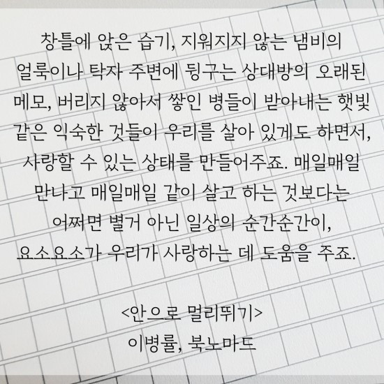 그렇게 사소한 순간이, 영원한 기억으로 새겨지는 일을 감당하는 게 살아가는 일, 사랑하는 일이겠지. 정작 사람의 마음을 여려지게 하는 건 그렇게 한줄기 바람처럼, 나뭇잎이 버석대는 소리처럼 너무나 사소하고 흔한 것들이다.