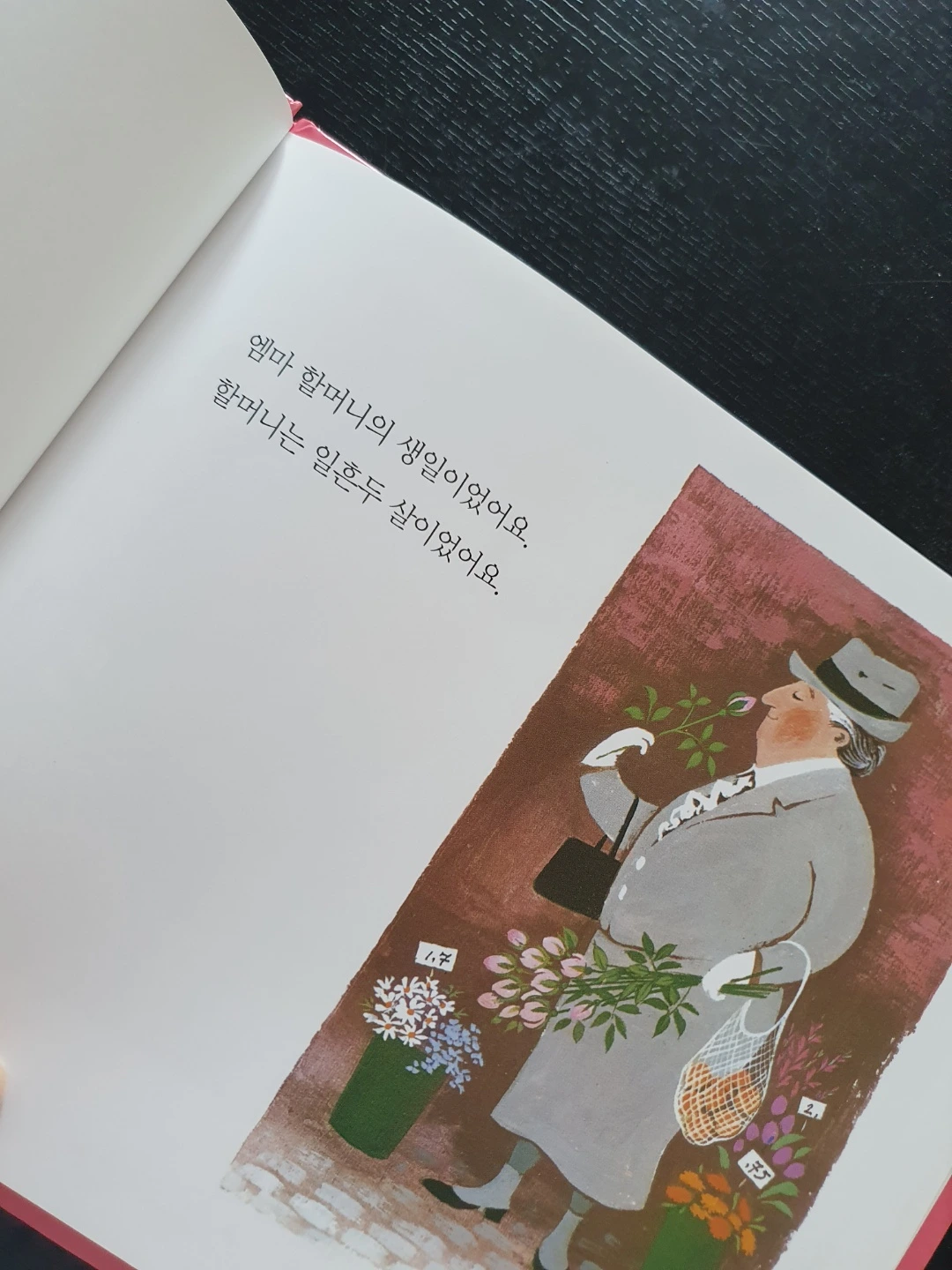 세월이 만들어준 근사한 흰 머리, 그 머리와 색을 맞춘듯 어울리는 회색 모자와 원피스, 경쾌한 소리를 가졌을 구두와, 물건을 곱게 다루겠다는 의지가 담긴 듯한 흰 장갑, 꽃을 살 줄 아는 멋을 가진 엠마 할머니. 첫 장에 펼쳐진 그림만으로도 엠마 할머니에 대해 알 수 있는 것은 많습니다. 할머니의 생일을 맞아 열명이 넘는 가족들이 선물과 함께 방문하지만 그리 오래 머무르지는 않습니다.