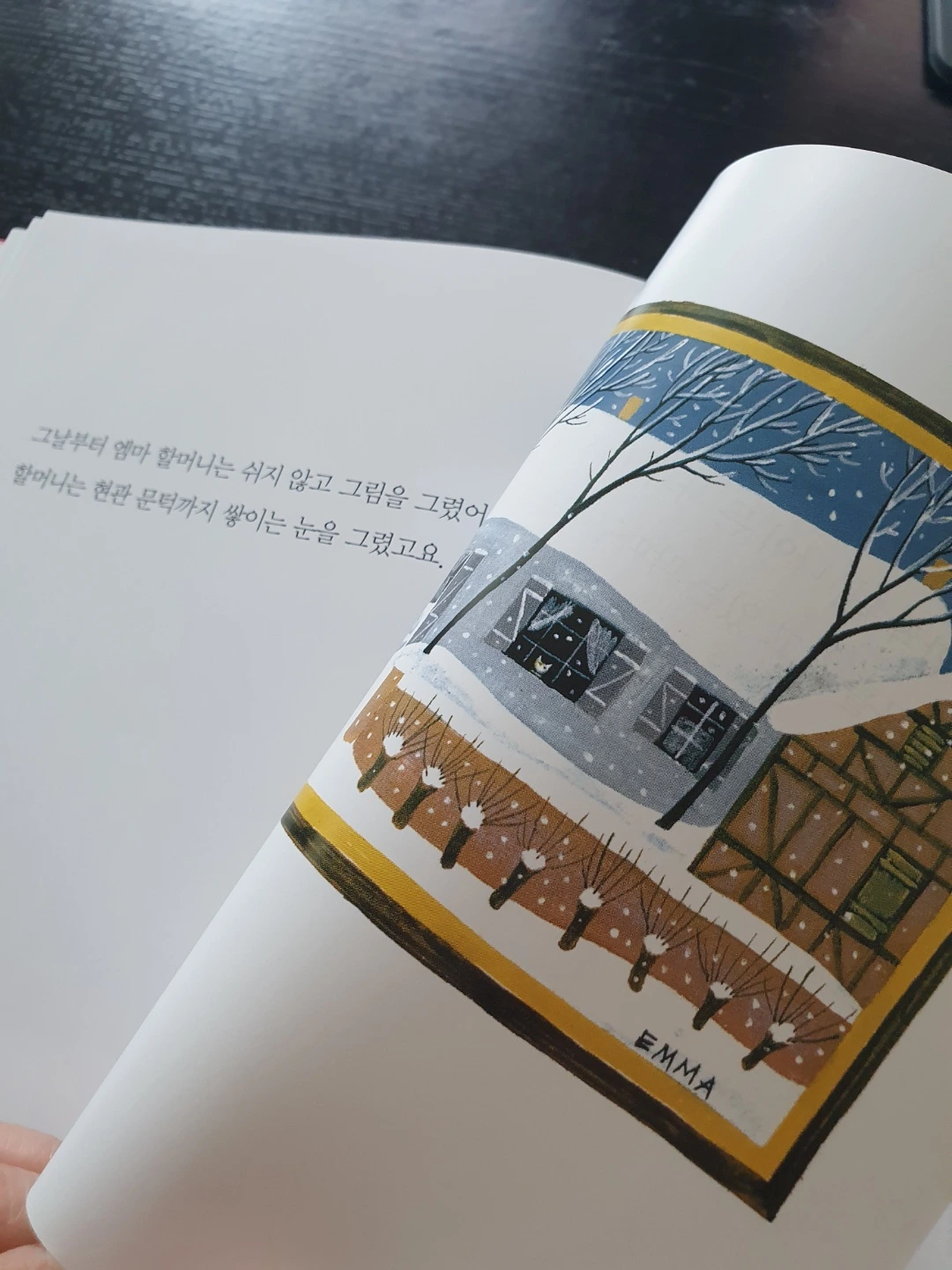 여기저기서 엠마 할머니의 그림을 보러 오기 시작했습니다. 그러나 사람들이 떠나고 나면 할머니는 또 혼자입니다. 우리가 잘 될 때는 꽃에 나비와 벌이 날아들듯 사람들이 모이기도 합니다. 하지만 비바람이 불고, 고독이 내려앉는 밤이 되면 홀로 흔들리면서도 견뎌야 하는 외로움을 우리 모두는 짊어지고 살아갑니다. 그 순간이 바로 엠마 할머니처럼 저마다의 물감과 붓, 이젤을 사서 그림을 그리기 아주 좋은 때라고 생각합니다. 차곡차곡 할머니의 집에 그림이 걸리기 시작합니다. 자신이 사랑하는 것들, 자신이 쏟아낸 진심들로 집을 단장합니다. 그래서 엠마는 예전처럼 오고 가는 사람들에 의해 자신의 존재가 결정되지 않습니다.