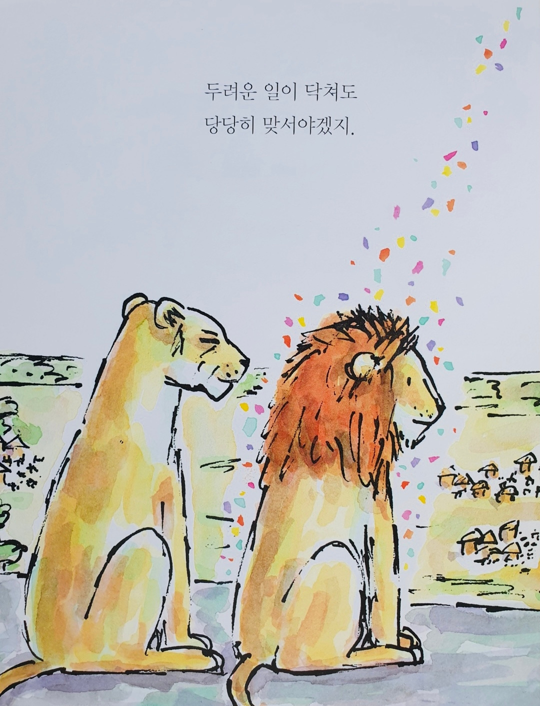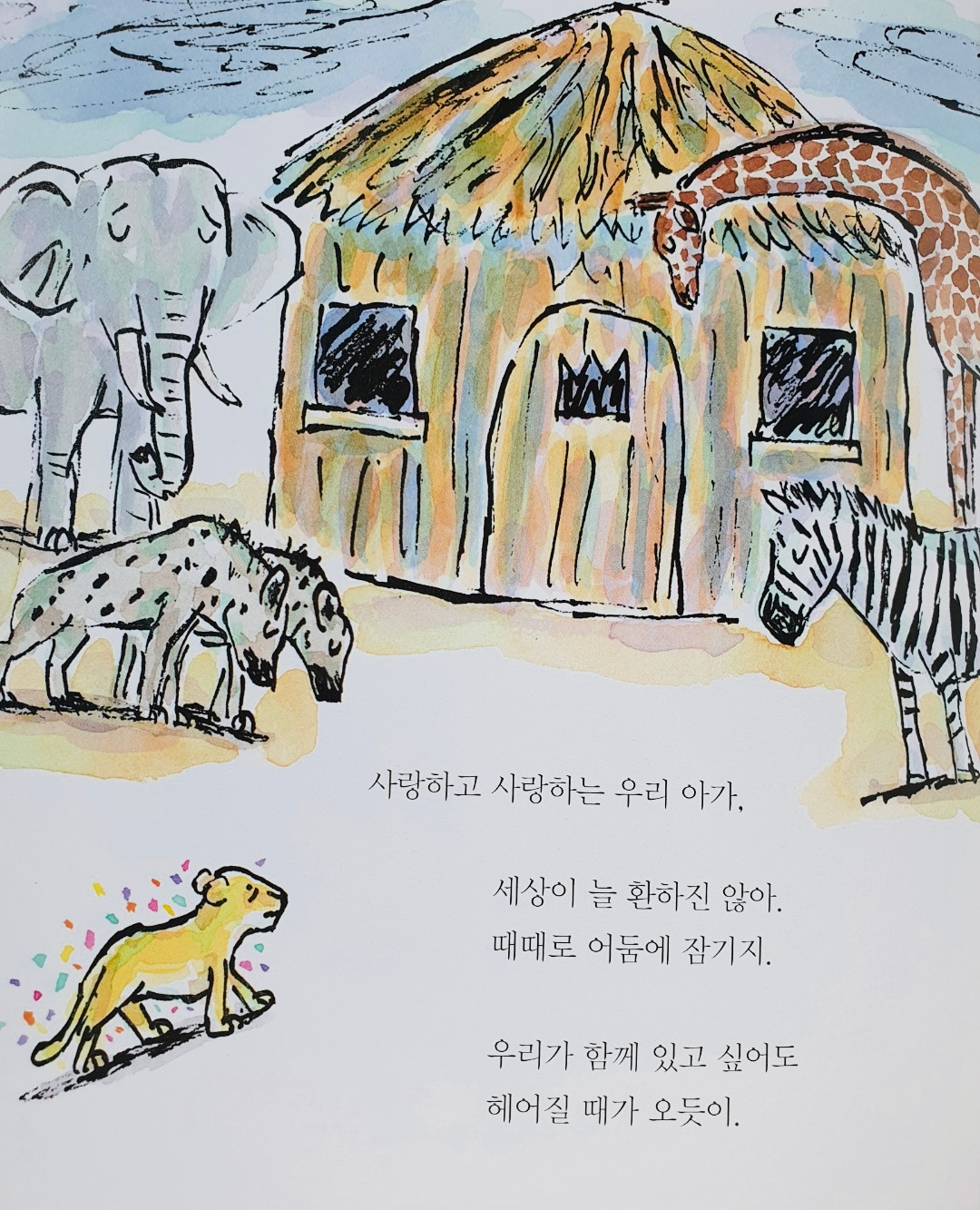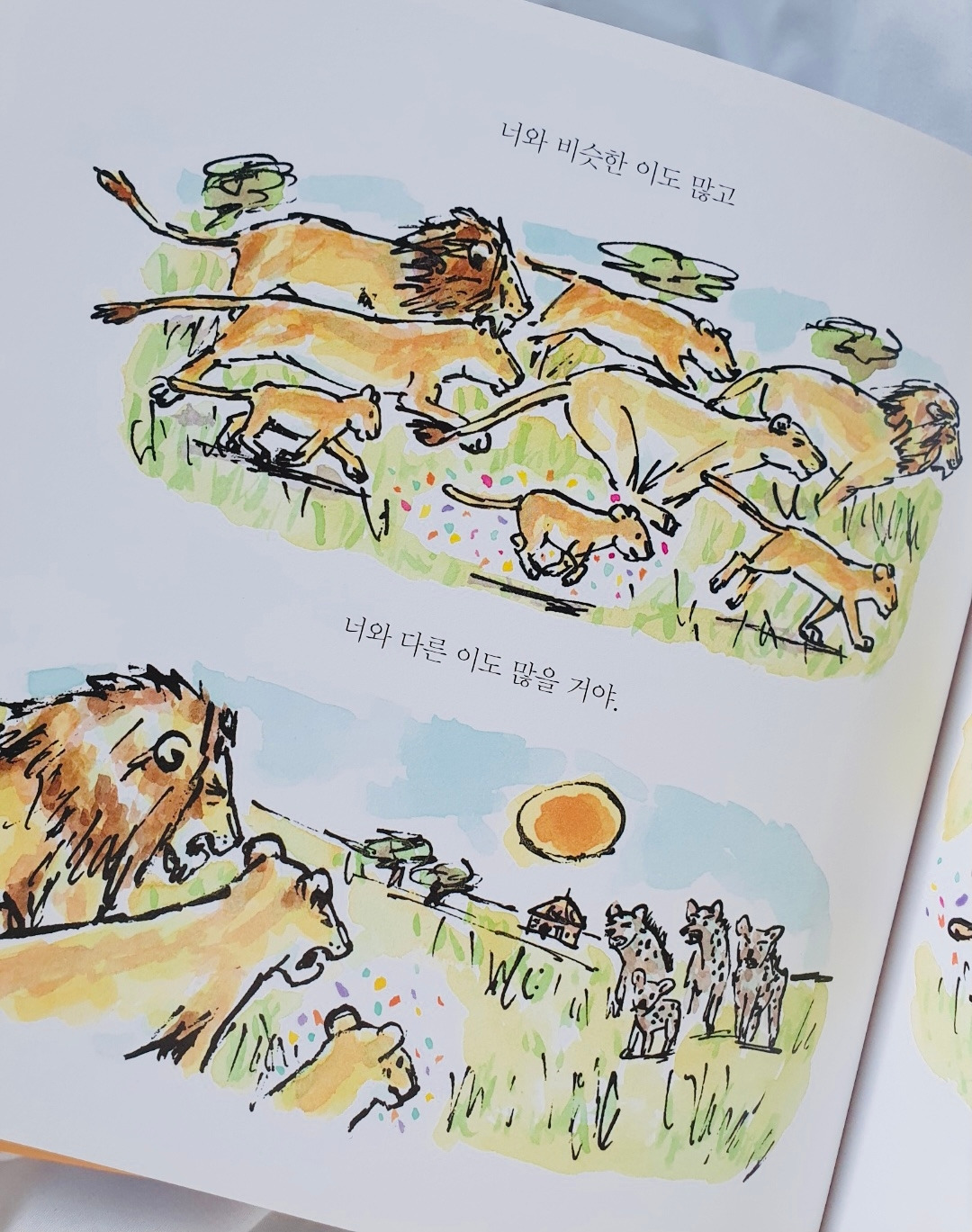 <너와 함께>라는 책이 마침 할아버지, 할머니 사자가 갓 태어난 사랑하는 새끼 사자에게 건네는 말들이기에, 엄마의 말들이 책의 내용과 함께 귀에 울려서 들렸습니다. 작은 소리에도 깜짝깜짝 잘 놀라는 내가 여러 가지 소리에 떨지 않고, 동요하지 않으며 의연하게 걸어가는 사자처럼 그렇게 삶을 걸어 나갈 수 있을지는 아직도 모르겠습니다. 하지만 부모님이 해주시는 말씀들이 마음 속에 살아 움직이며 나를 다독일 것이고 나를 키워갈 것이라 생각합니다.