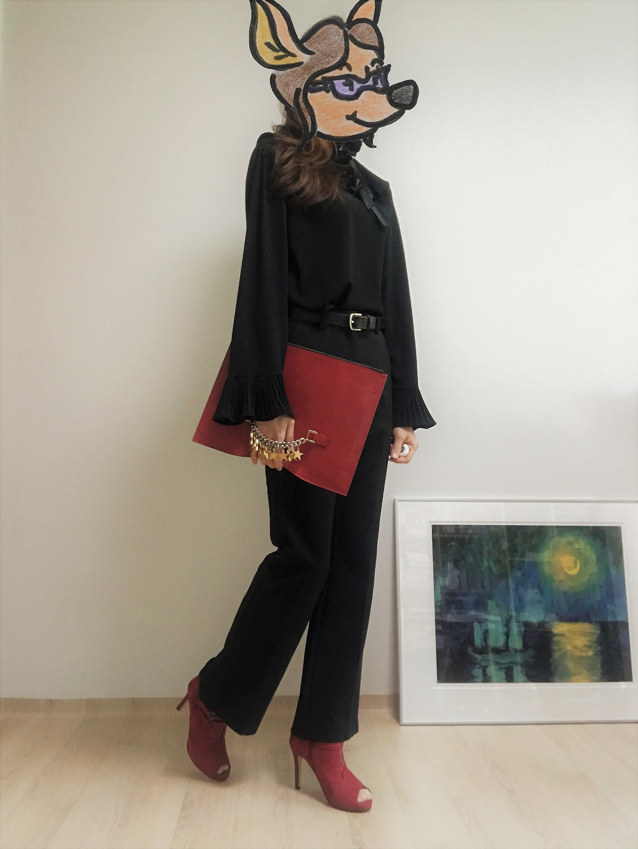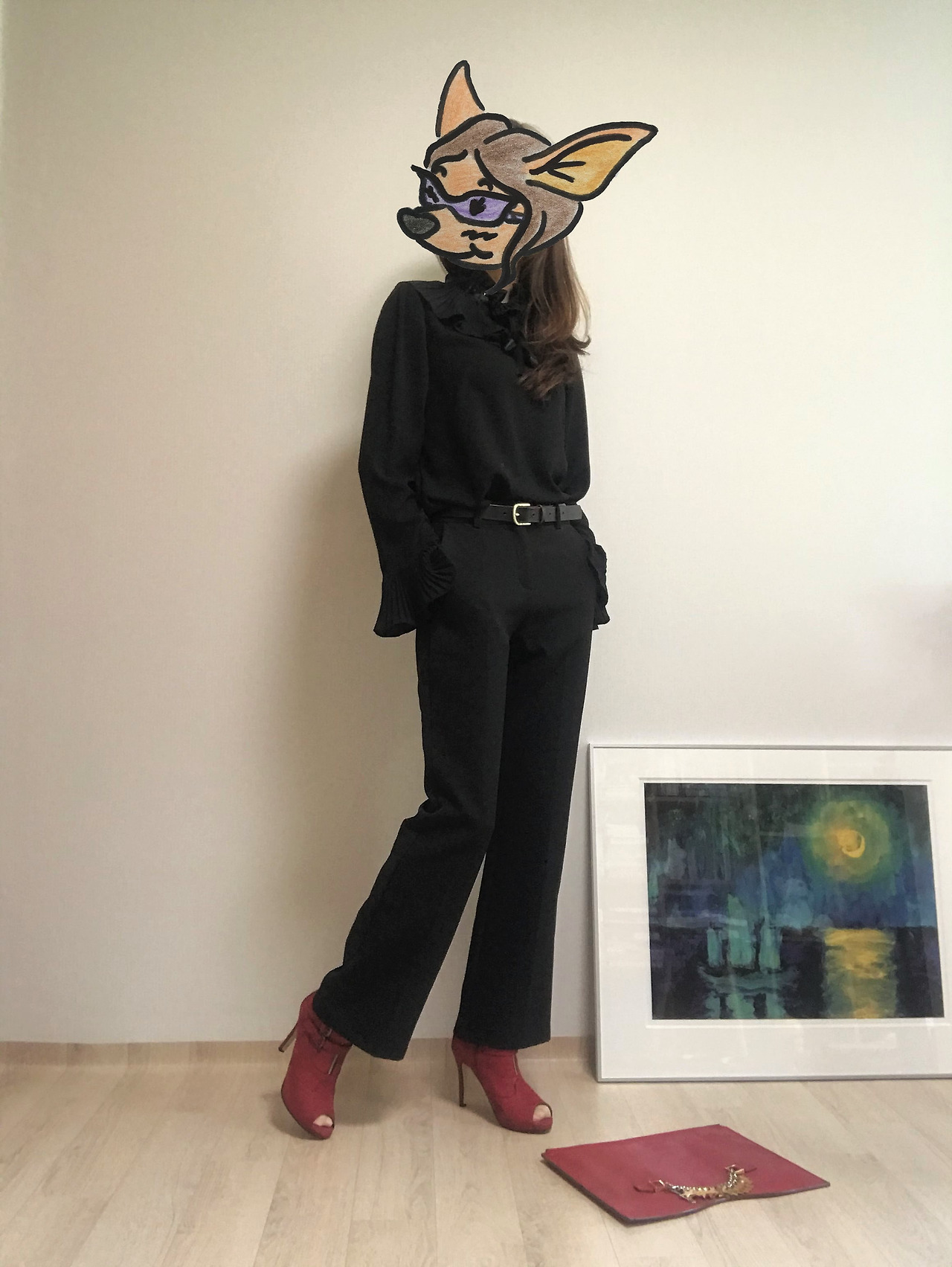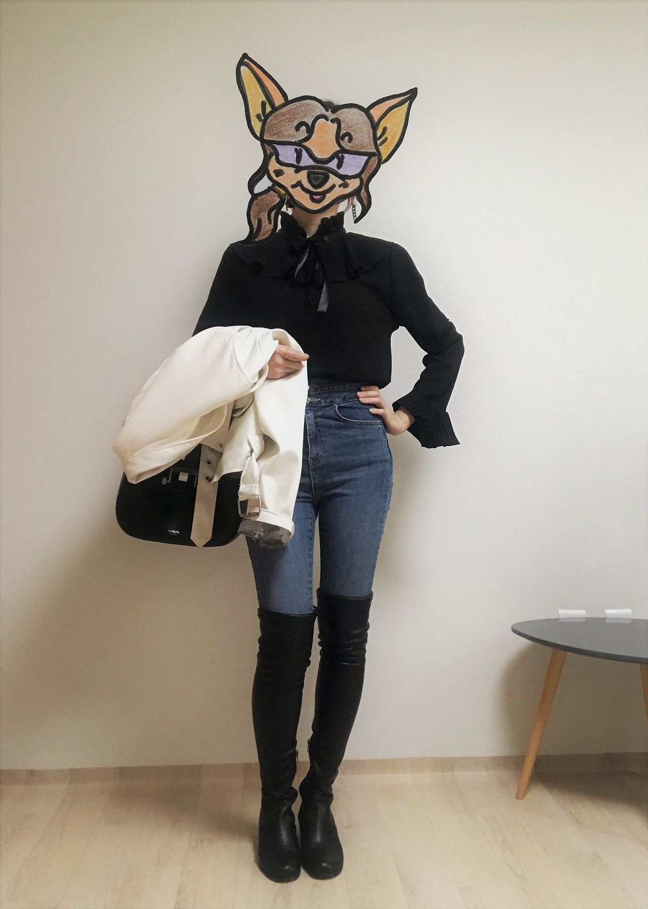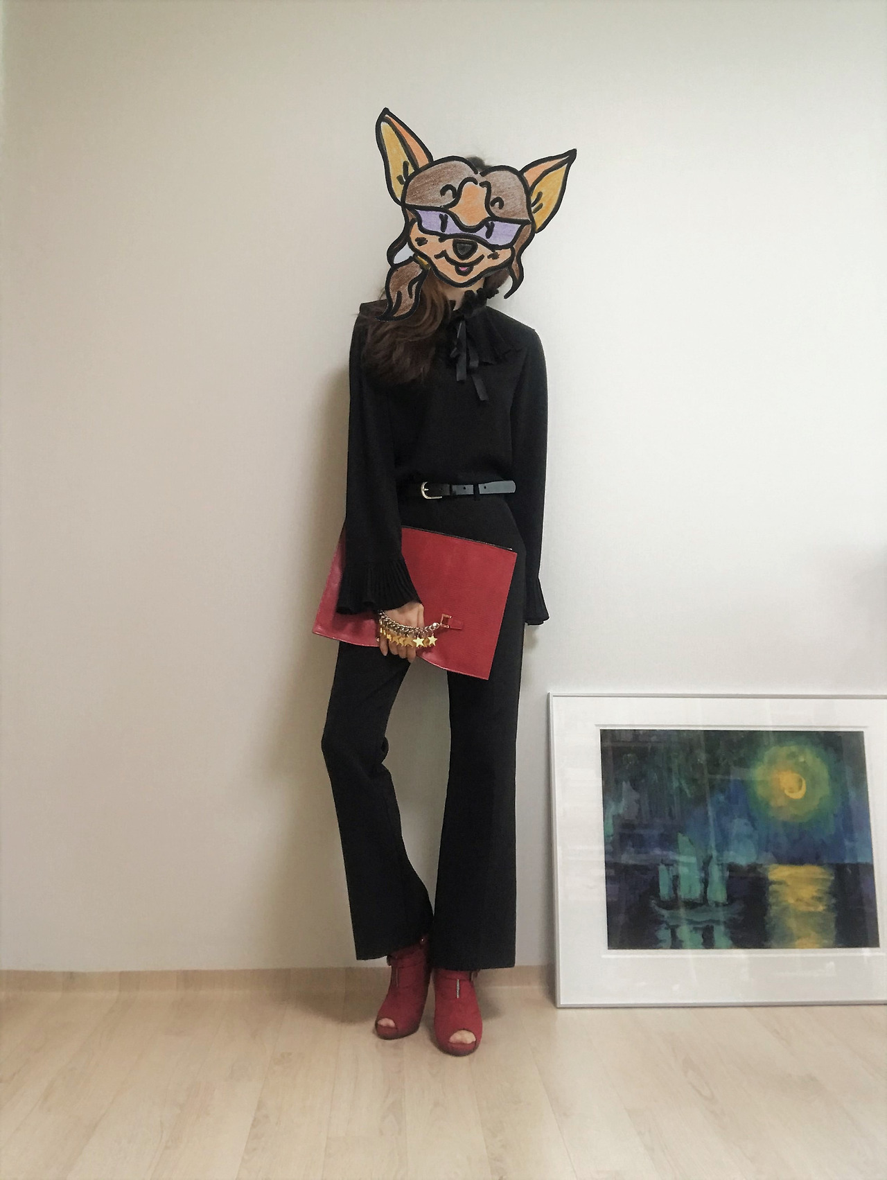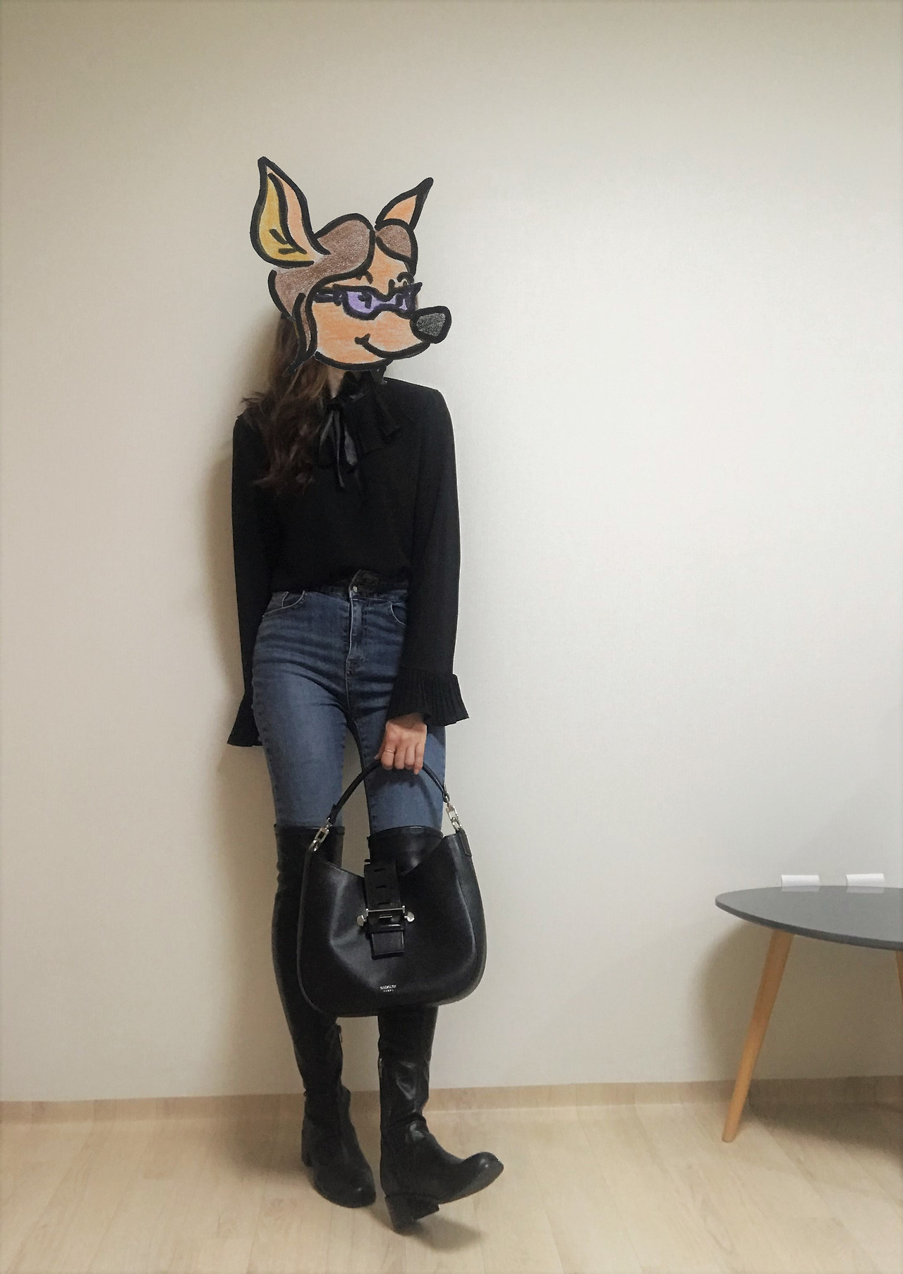 엄마의 이 블라우스는 목둘레와 소맷단에 나풀거리는 프릴 장식이 있고 그 위로 가느다란 리본 타이가 한 번 더 둘려 있다. 실용성과 활용도를 고려해 거의 기본 실루엣의 옷으로 채워지진 내 옷장에서는 좀처럼 찾아보기 힘든 디자인이다. 하지만 장식적인 요소가 많아도 전체적인 톤이 검정으로 통일되어 있어 나름의 밸런스를 지켰다. 올블랙에 포인트를 주는 단순한 룩부터 시도해보면 점점 활용도를 높여갈 수 있을 것이다. 호기심이 싹트는 지점이다.