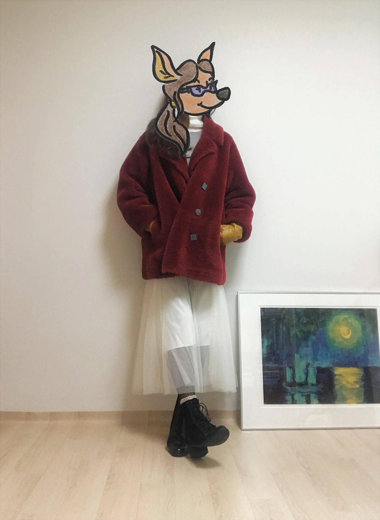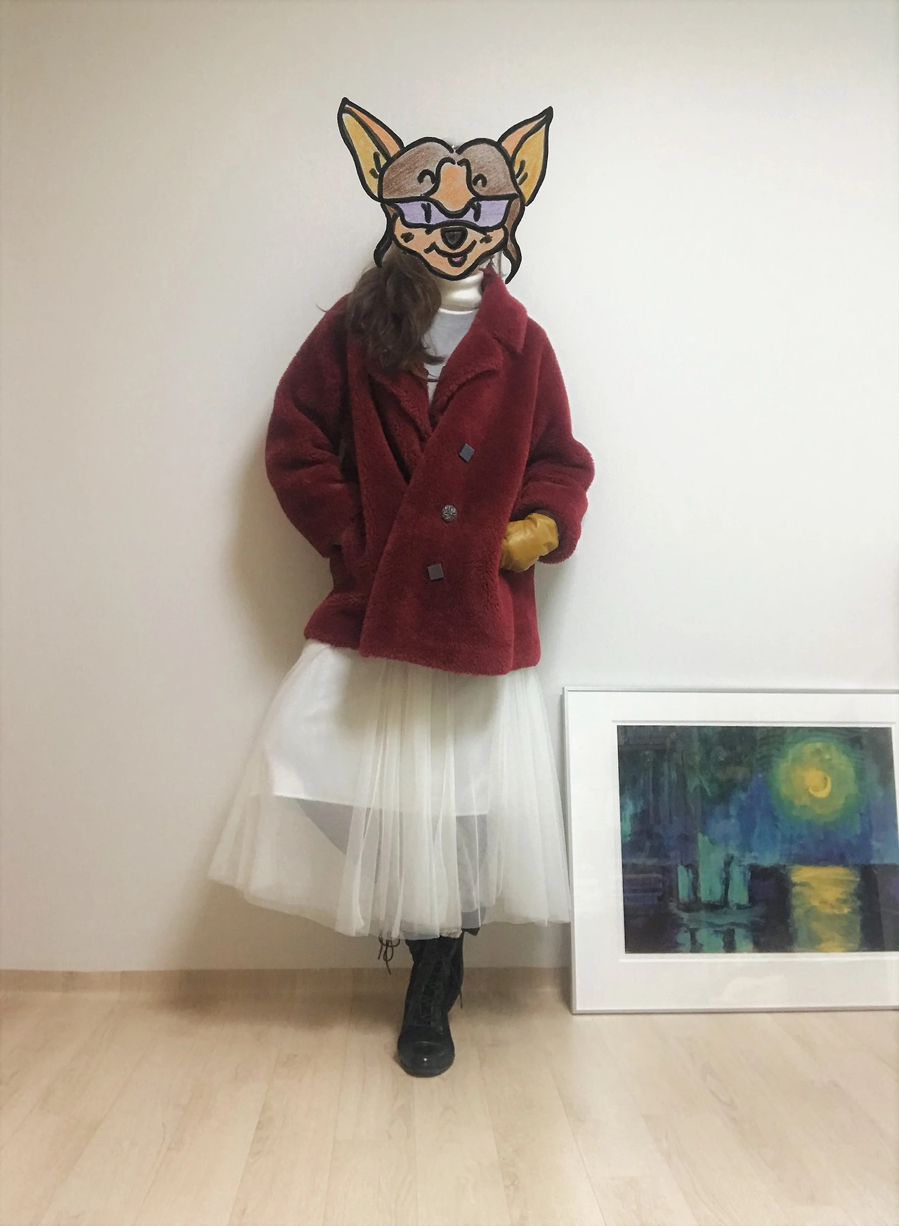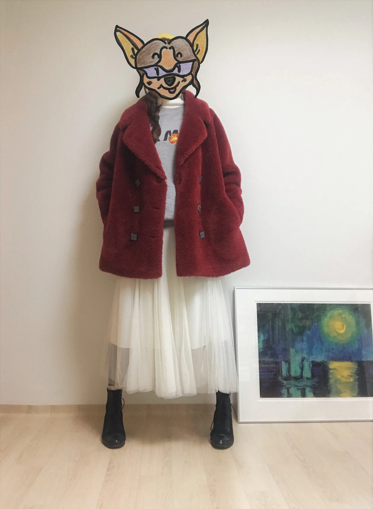 하나는 엉덩이를 살짝 덮는 길이의 회색 맨투맨 티셔츠에 흰색 튤 스커트를 매치한 룩. 앵클부츠나 구두보다는 포근한 양말에 스니커즈가 어울렸다. 여기에 대만 로컬샵에서 기념으로 산 도토리 모자를 얹어주면, 장난기 충만한 캐주얼룩 완성. 엄마의 빨간 테디베어 코트도 한 번 더 꺼내 입어본다.