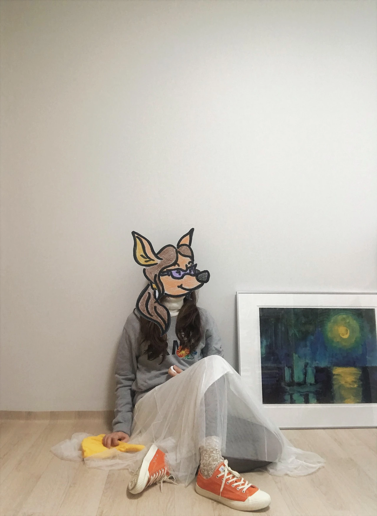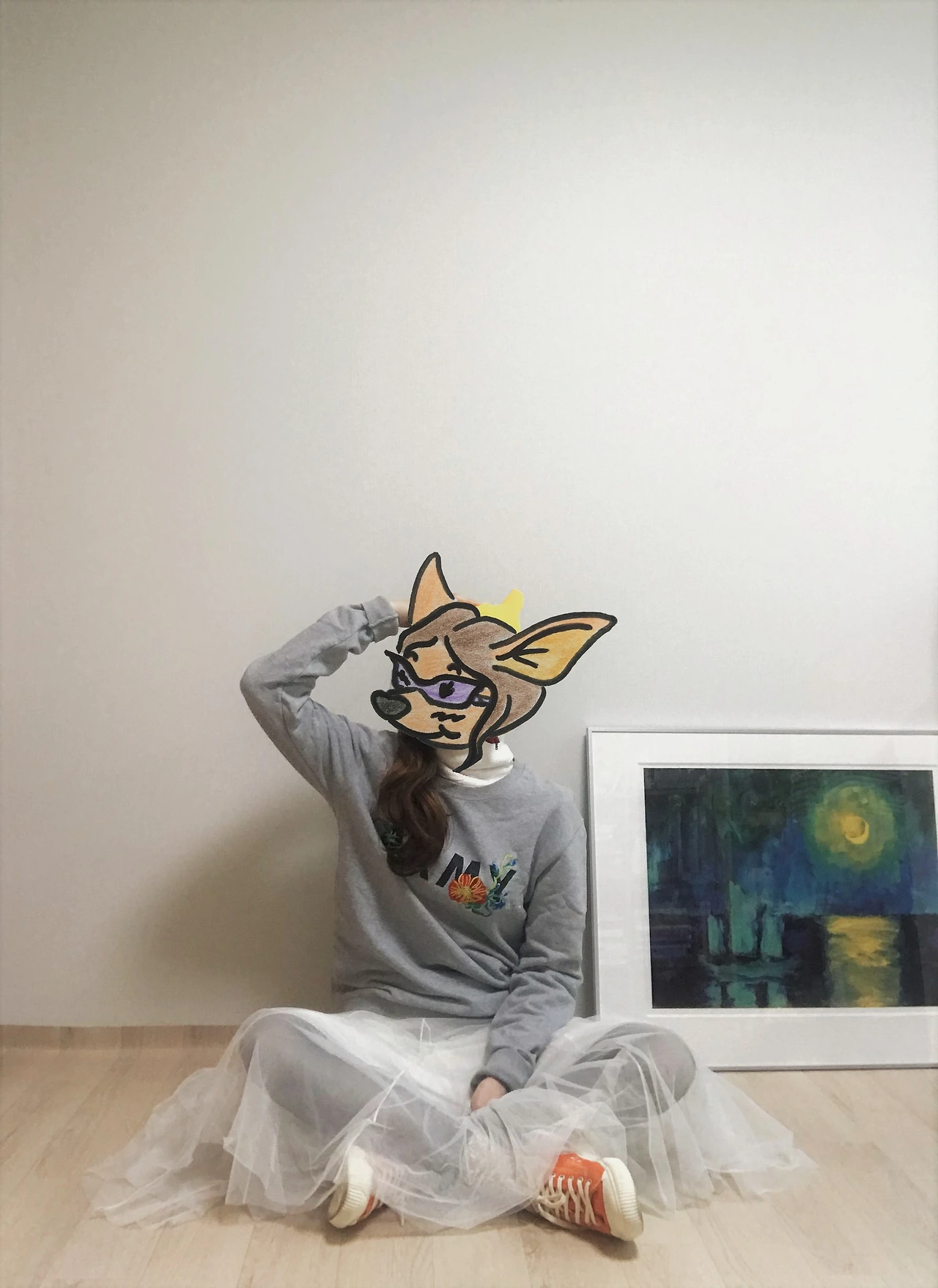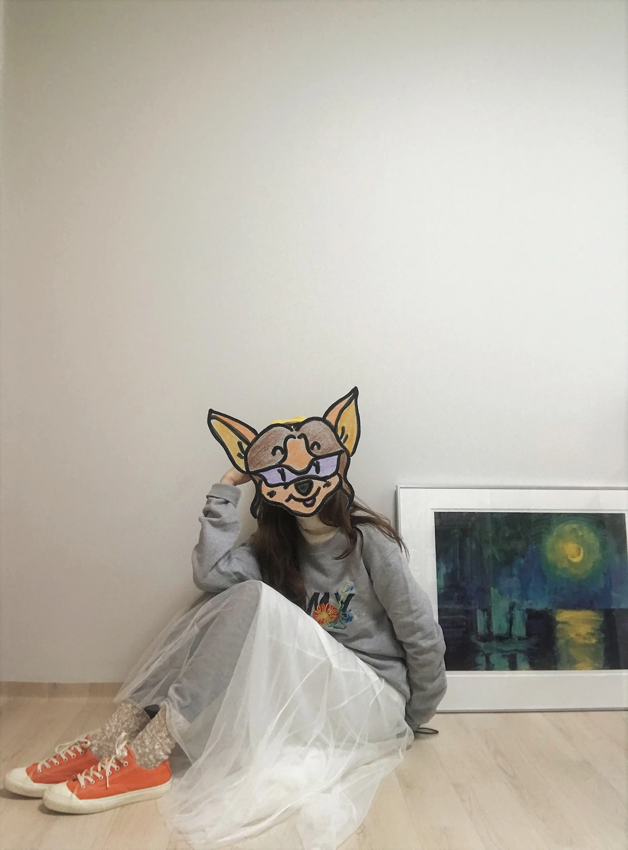 하나는 엉덩이를 살짝 덮는 길이의 회색 맨투맨 티셔츠에 흰색 튤 스커트를 매치한 룩. 앵클부츠나 구두보다는 포근한 양말에 스니커즈가 어울렸다. 여기에 대만 로컬샵에서 기념으로 산 도토리 모자를 얹어주면, 장난기 충만한 캐주얼룩 완성. 엄마의 빨간 테디베어 코트도 한 번 더 꺼내 입어본다.