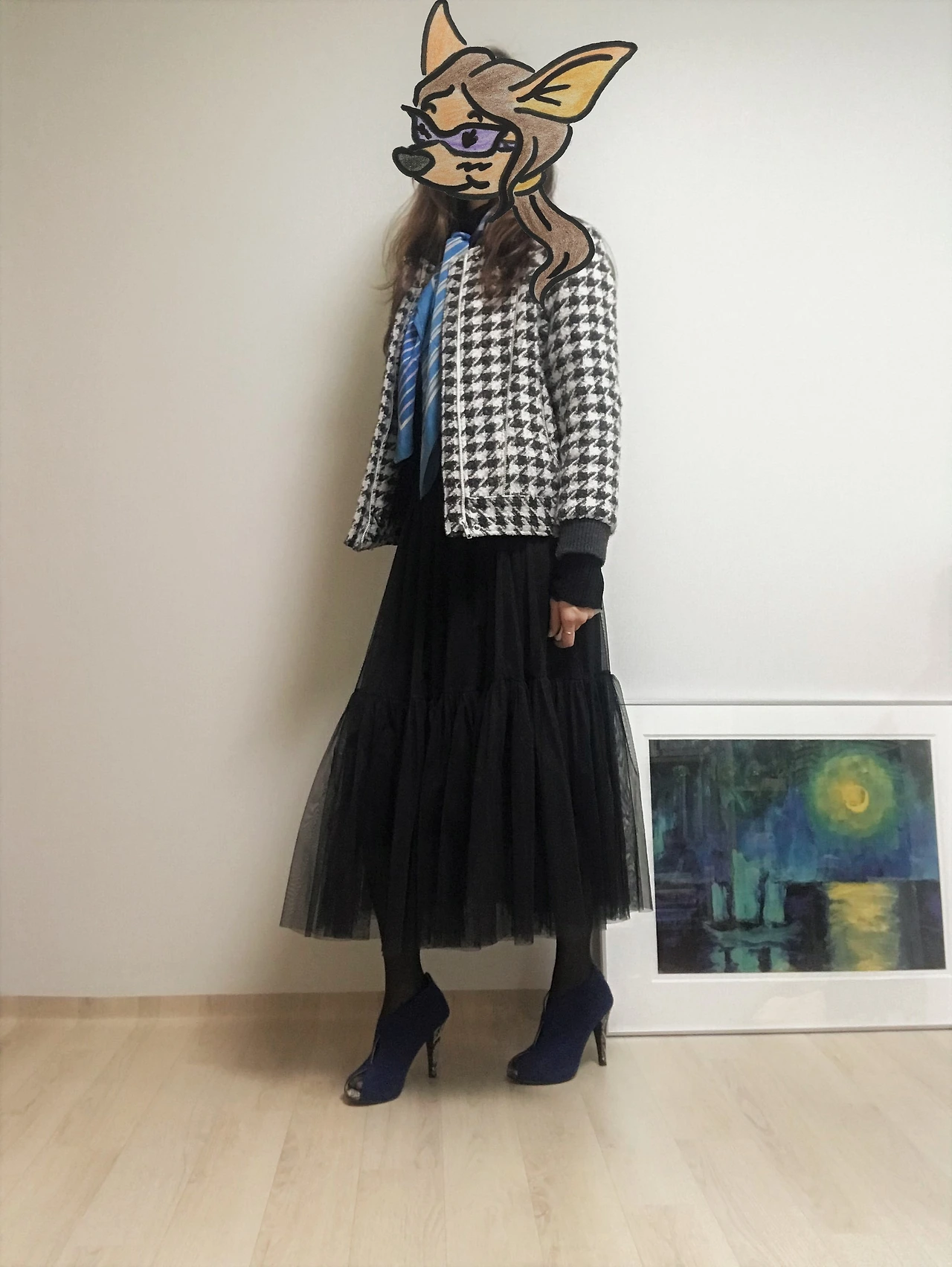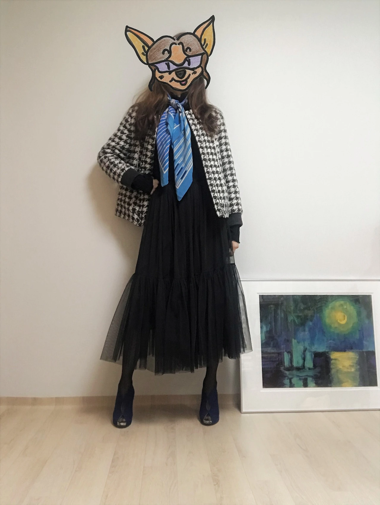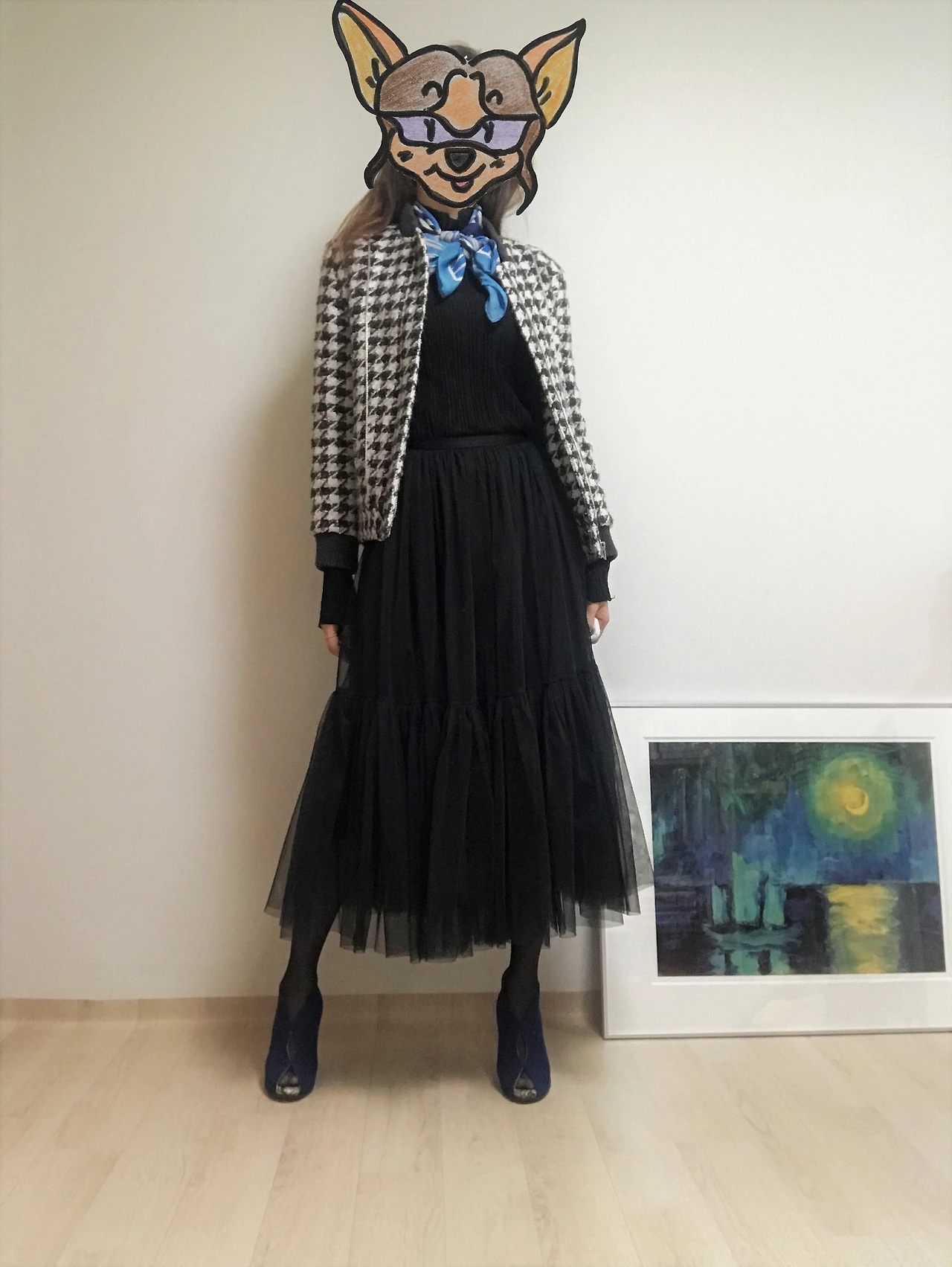 결국 한껏 차려입은 듯한 분위기를 적절히 쿨 다운 할 수 있는 할 수 있는 아이템만 있으면 얼마든지 일상생활에서도 튤 스커트를 즐겨 입을 수 있다는 얘기다. (그렇구나, 이 공주풍의 옷을 부끄러워하지 않고 입을 방법이 있구나!) 튤 스커트의 확장성은 의외로 무한했고, 웹에서 관련 이미지들을 검색하다 보니 내 서랍에서 당장 꺼내 입을 만한 아이템이 생각났다. 아가일 패턴이나 체크 패턴이 들어간 클래식한 스웨터, 맨투맨 티셔츠, 그래픽 티셔츠 등등이었다. 그래서 가장 기본이 되는 블랙 & 화이트 무채색 튤 스커트와 어울리는 스타일링 두 가지를 시도해보았다.