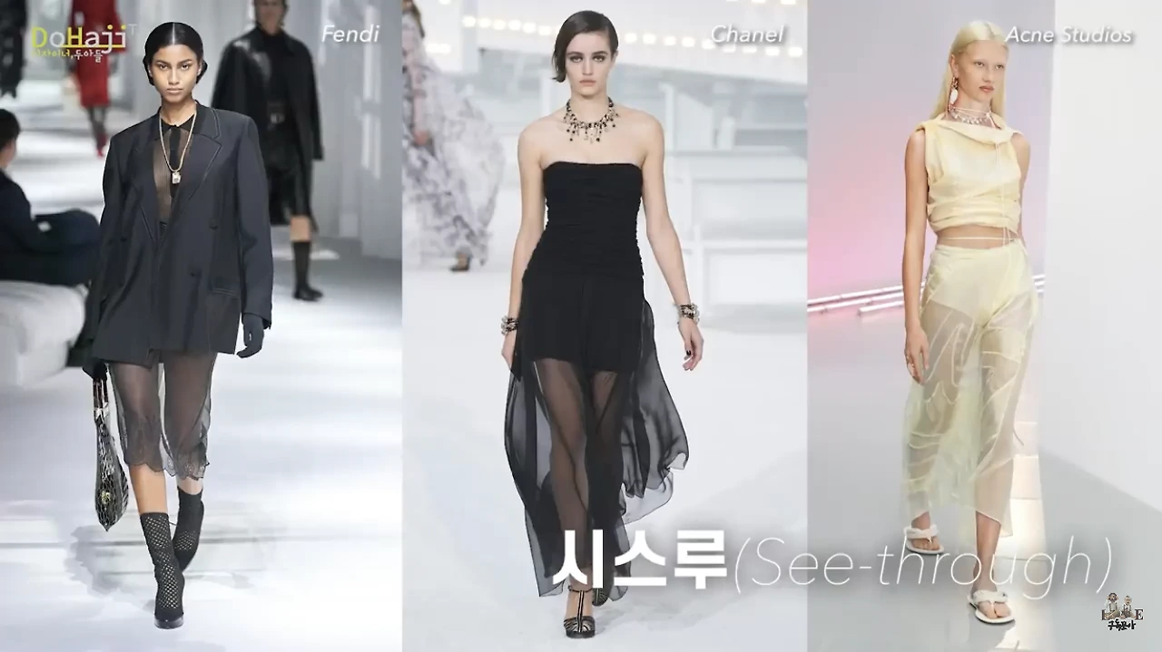 - 시스루와 레이어드(속이 비치는 소재의 옷을 여러 겹 레이어드 - 관능적이고 스타일리시 한 이미지 연출)