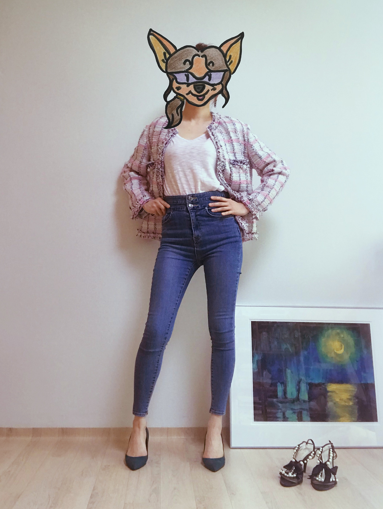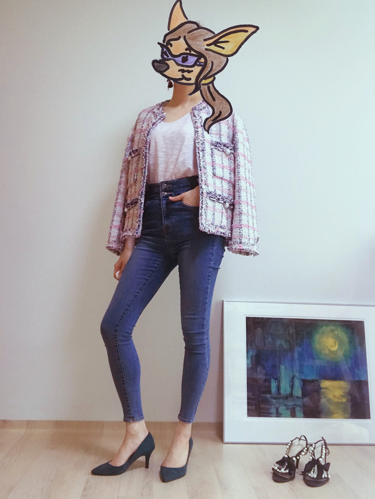 다음으로는 데이트룩으로 워싱이 거의 들어가지 않은 하이웨이스트 스키니진이다. 다리라인이 예뻐 보이라고 힐을 신었지만 여기에 흰색 운동화를 신어도 잘 어울린다. 흰 티에 청바지, 흰 스니커즈는 기본 중의 기본, 거기에 이 재킷 하나만 걸치면 확실한 포인트가 된다.