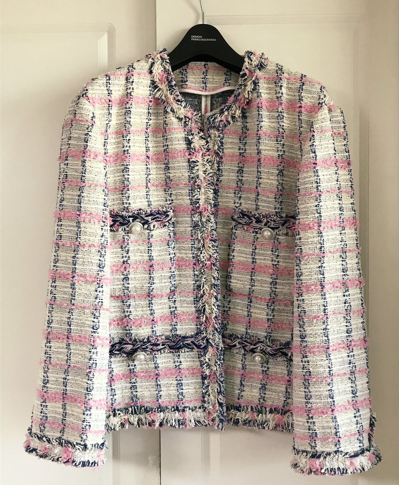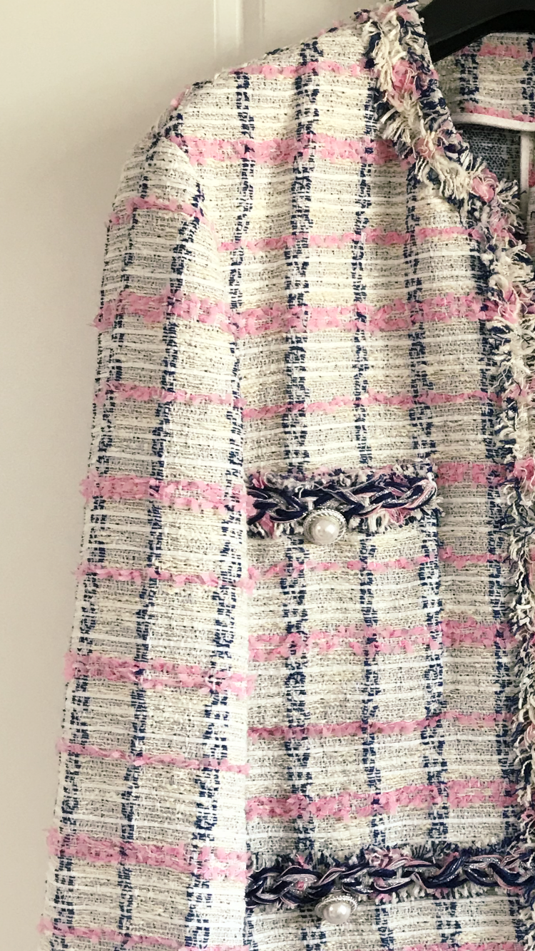 그런데 엄마가 고른 이 #트위드 재킷을 보고 생각이 바뀌어 버릴 수밖에 없었다. 우선 한눈에 봤을 때 정말 예뻤다. 핑크색과 남색의 대비되는 컬러 매치에서 느껴지는 산뜻함, 굵은 실의 짜임이 그대로 느껴지는 도톰하고 부들부들한 감촉, 색색 실 중간에 섞여 있는 은색 실의 반짝임, 그 반짝임과 잘 어울리는 은빛 테두리의 진주 버튼까지. 이 모든 게 지나치게 무겁지도 가볍지도 않아 조화로웠다. 이런 트위드 재킷이라면 지난날의 편견과 두려움을 기꺼이 극복하고 한 번 시도해 볼 만하다고 느낀 순간, 어느새 나는 사이즈를 걱정할 틈도 없이 이 친구를 걸치고 있었다...! 다행히 조금 넉넉한 핏으로, 무리 없이 입을 수 있었다. (그래, 자켓은 오버핏이지, 너무 딱 맞으면 면접보러 가는 것 같잖아, 쿨하지 못해!�)