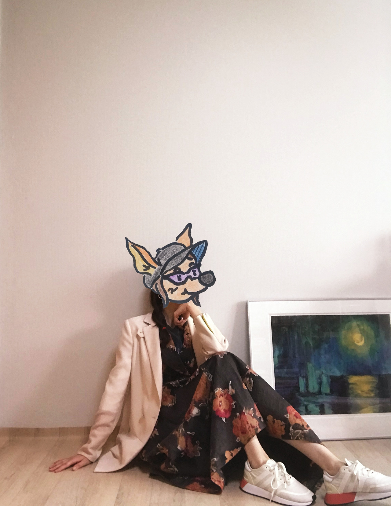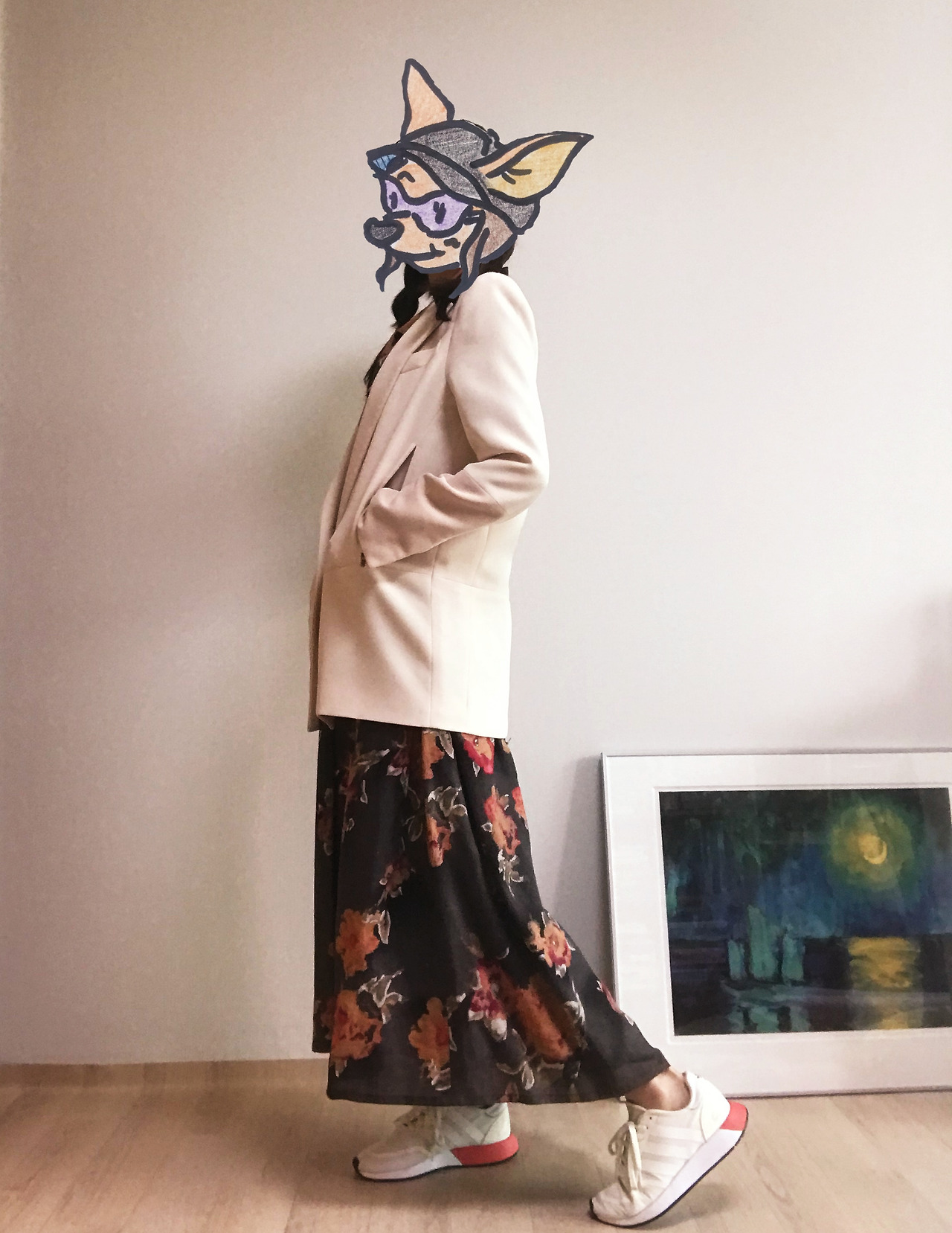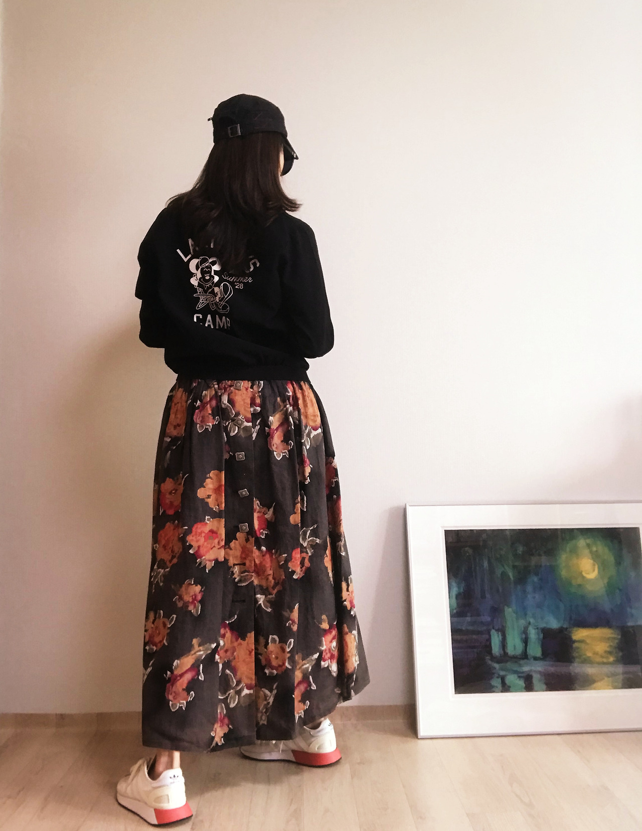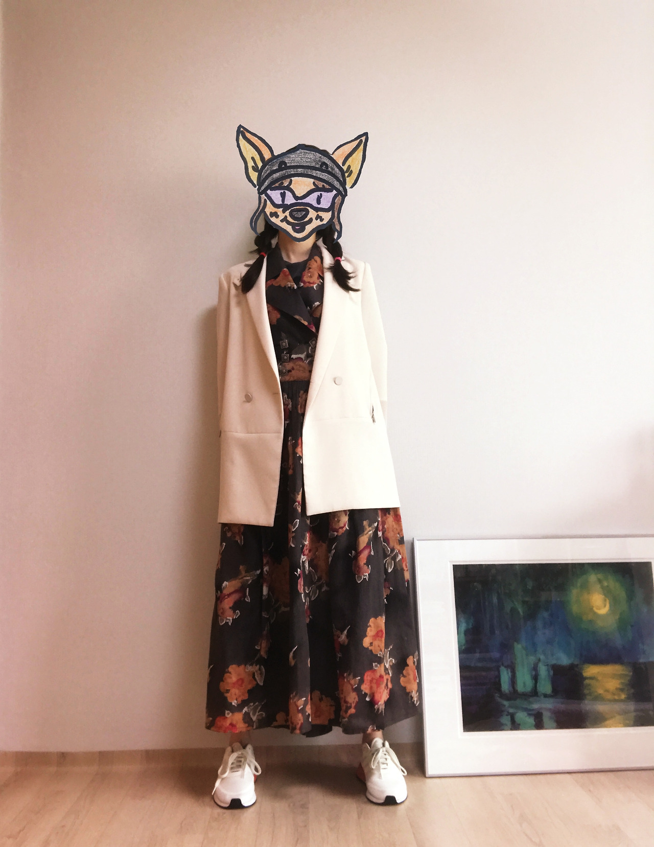 그러다 몇 주전에 구독하던 유튜브 채널에서 ‘스커트/원피스와 운동화의 조합’을 다룬 콘텐츠를 보았다. 집에 있는 "잘 안 입는 원피스나 패턴이 복잡해서 옷 맞춰 입기가 난해한 스커트가 있다면 흰 운동화와 매치해보라"라는 조언이었다. 거기에 오버사이즈 재킷, 볼캡까지 있으면 금상첨화라는 말도 함께…! 나는 이번에야말로 실험에 나설 때라고 생각했다. 엄마의 옷장에서 보았던 오래된 빈티지 드레스를 꺼내 보기로 한 것이다.