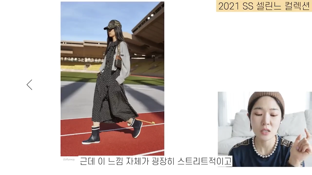 이번 S/S 시즌 트렌드를 찾아보면서 꼭 해보고 싶었던 룩이 하나 있었다. 바로 셀린(CELINE)의 패턴 원피스+ 볼 캡+레인부츠 를 조합한 룩이다. 아래 셀린의 런웨이 컷과 블랙핑크 리사의 보그 재팬 화보를 보면 어떤 모습인지 한눈에 알 수 있다. 사실 이 세 가지 아이템을 각각 따로 떼어놓고 보면 그 어느 것도… 내 돈 주고 사고 싶은 물건은 없다. 물방울무늬 원피스는 아무리 봐도 할머니 옷 같고 (심지어 그 위에 걸친 카디건도), 저 밀리터리 패턴의 캡은 리사 말고 그냥 일반인이 쓰면 예비군 되는 거 아닌가? 레인부츠는 비 오는 날 아니면 굳이 신고 싶다고 생각해본 적 없다. 그런데 이 셋을 조합해서 런웨이에 올리다니, 심지어 그게 힙 해 보이다니…!