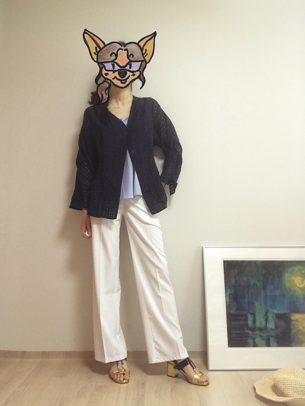 신경 쓴 부분이 페플럼만은 아니었다. 소매 끝은 카라 꽃 모양으로 디자인되어 있고 소매는 전체적으로 상하 방향의 셔링을 잡아 볼륨감을 주되 유치한 느낌은 들지 않은, 공들여 만든 옷임을 알 수 있었다. 여름만 되면 빈약한 팔 때문에 반소매나 민소매를 입을 때 항상 신경이 쓰였던 나로서는 신체적 단점을 이렇게 옷 자체의 디자인으로 자연스럽게 감출 수 있다는 점이 무척 마음에 들었다. 하의는 사진상으로는 차이가 잘 보이지 않지만, 지난주에 입었던 아이보리색 정장 바지보다 조금 더 얇은 화이트 팬츠다. 바지 밑단이 아래로 갈수록 아주 살짝만 퍼지는 느낌이라 편하고 밑단의 여유분이 충분한 상의와도 잘 어울렸다.