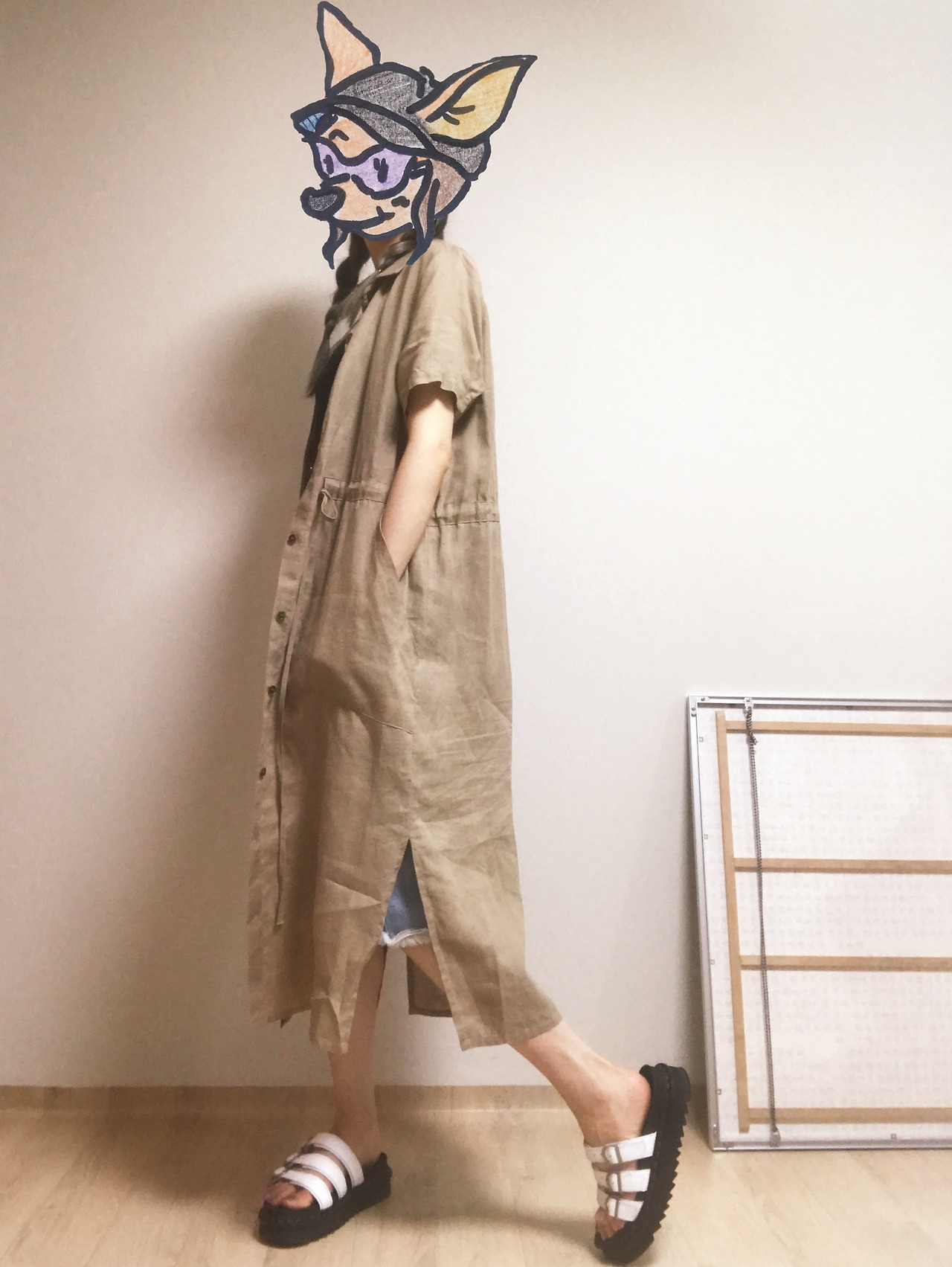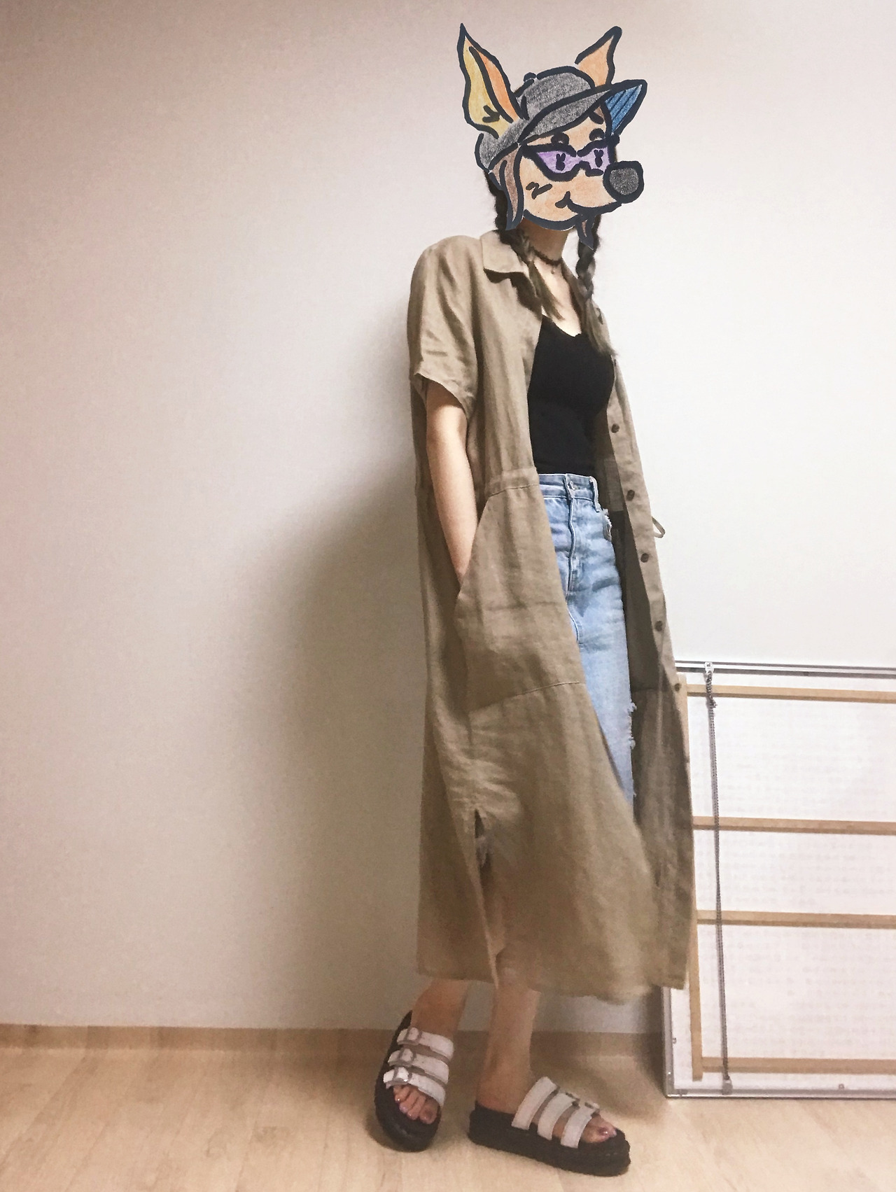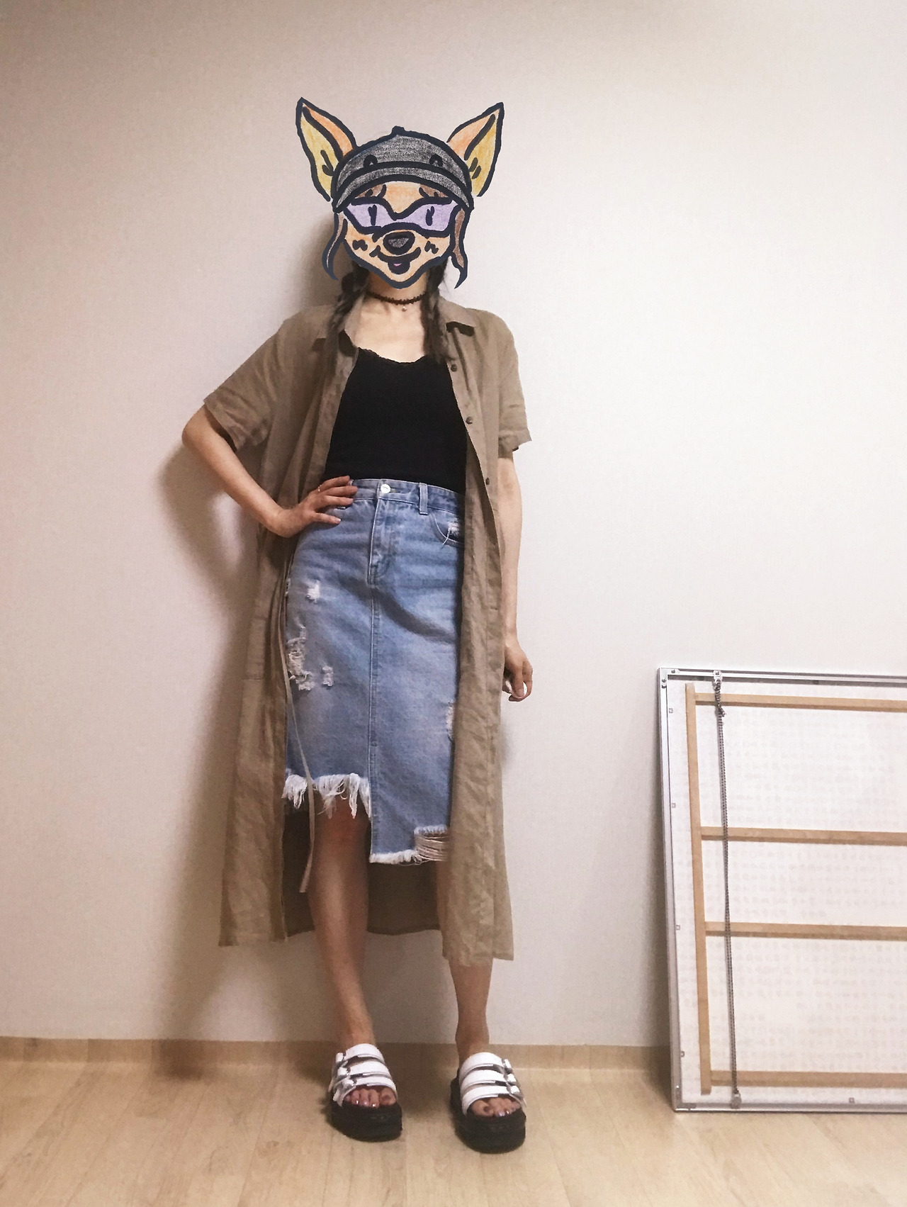 촬영을 하다 보니 데님 소재와도 잘 어울릴 것 같아서 바지만 청치마로 갈아입고 몇 컷 더 찍어보았다. 라이트 한 색감에 군데군데 헤지고 올이 풀린 디테일이 멋스러운 이 청치마는 딱 여름 한정으로 작년부터 입었던 나의 애장품 중 하나다. 생각대로 카키색의 리넨 아우터와 편안하게 잘 어우러져서 이렇게 입고 당장 어디든 놀러 가고 싶은 마음이 들었다. (휴가 계획들은 다들 세우셨나요? 나만 아직 예약 전인가??)