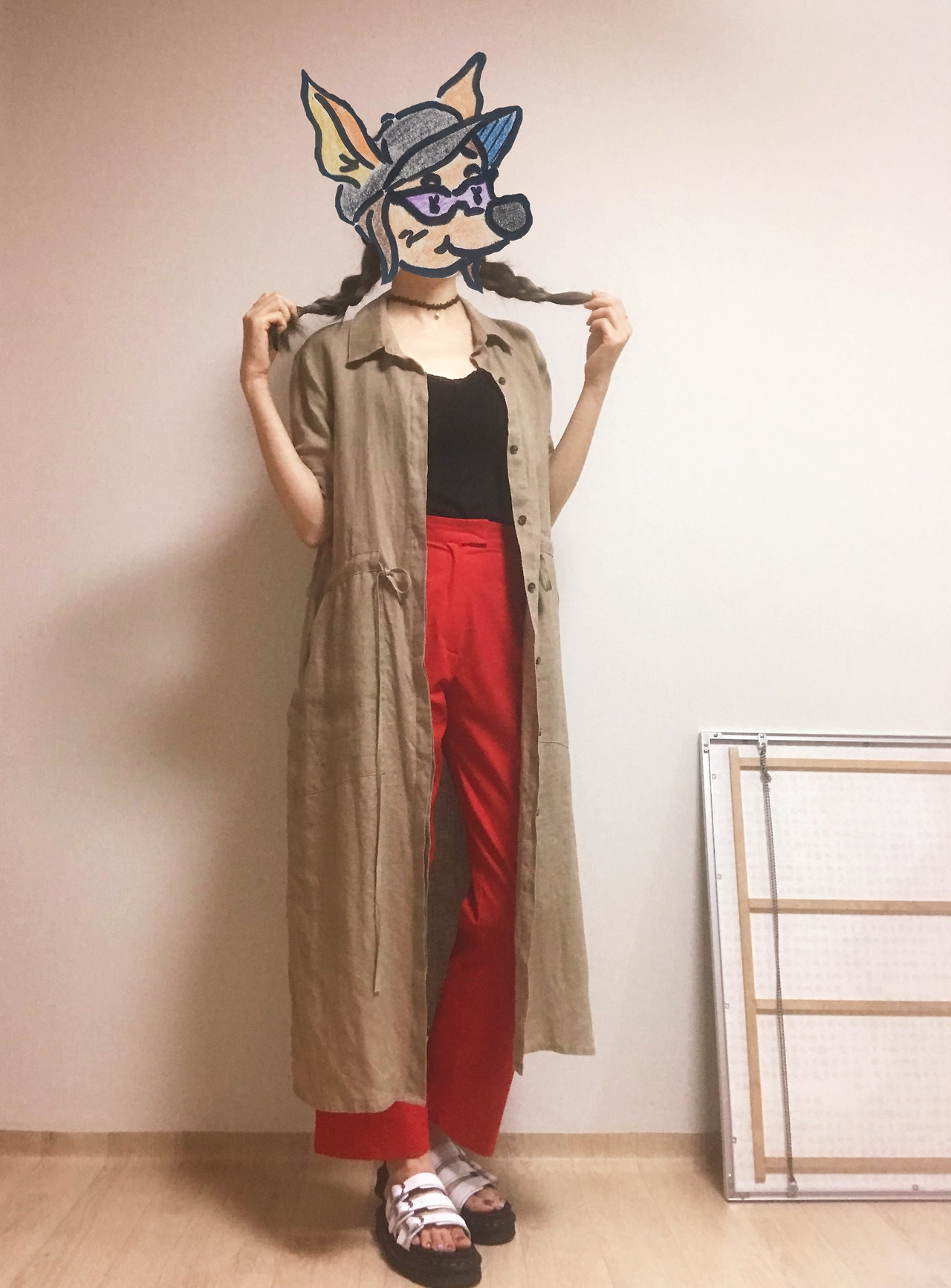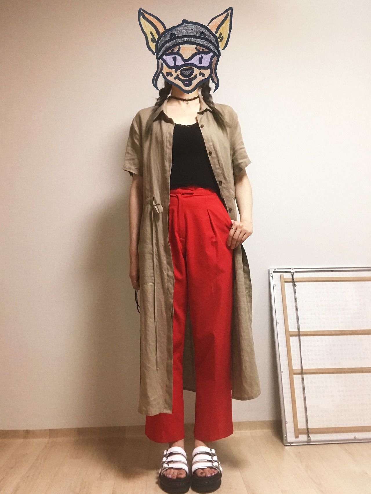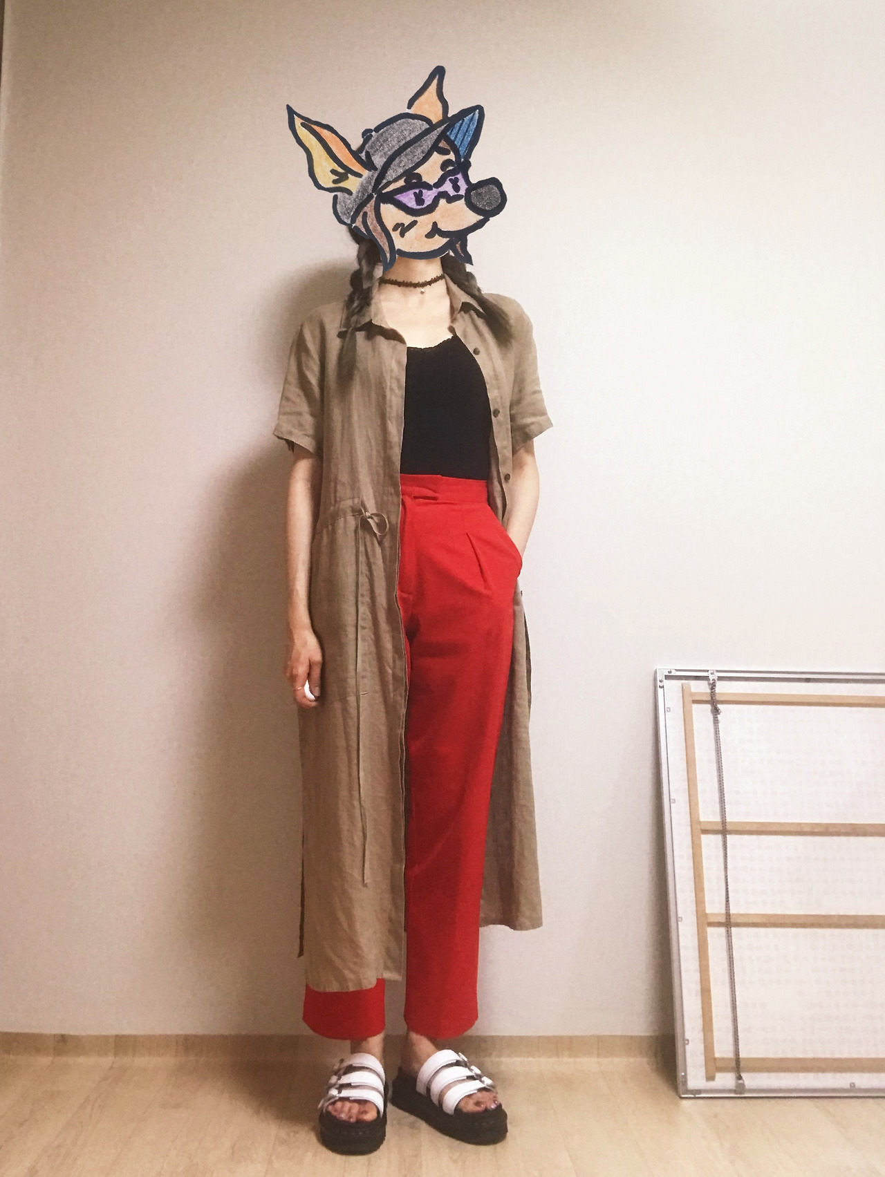 오늘은 그런 엄마의 옷장에서 빌린 카키색 리넨 원피스를 아우터로 활용해서 한여름에도 즐길 수 있는 빨간 바지 룩을 준비해봤다. 빨간색이 여름에는 더워 보일 거라고 생각할 수 있지만, 이렇게 강렬한 원색은 흰색, 검은색, 회색 등 무채색과 코디하기 쉽고 같이 있으면 대비되는 효과를 주어 더 산뜻해 보인다. 특히 사진 찍으면 확실히 알 수 있다. 봄엔 티셔츠와 재킷으로, 여름엔 슬리브리스 탑에 리넨 소재 아우터로 시원하고 편안하게 스타일링했다. 원피스를 아우터로 활용한 이유는 원래 원피스로 입기엔 옷이 좀 컸기 때문이다. 하지만 덕분에 옷 하나의 여러 쓰임새를 발견하고 빨간 바지와의 조화도 생각해 낼 수 있었기에 썩 괜찮은 선택이었다.
