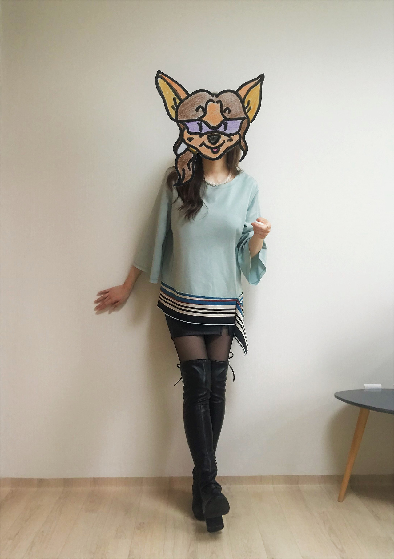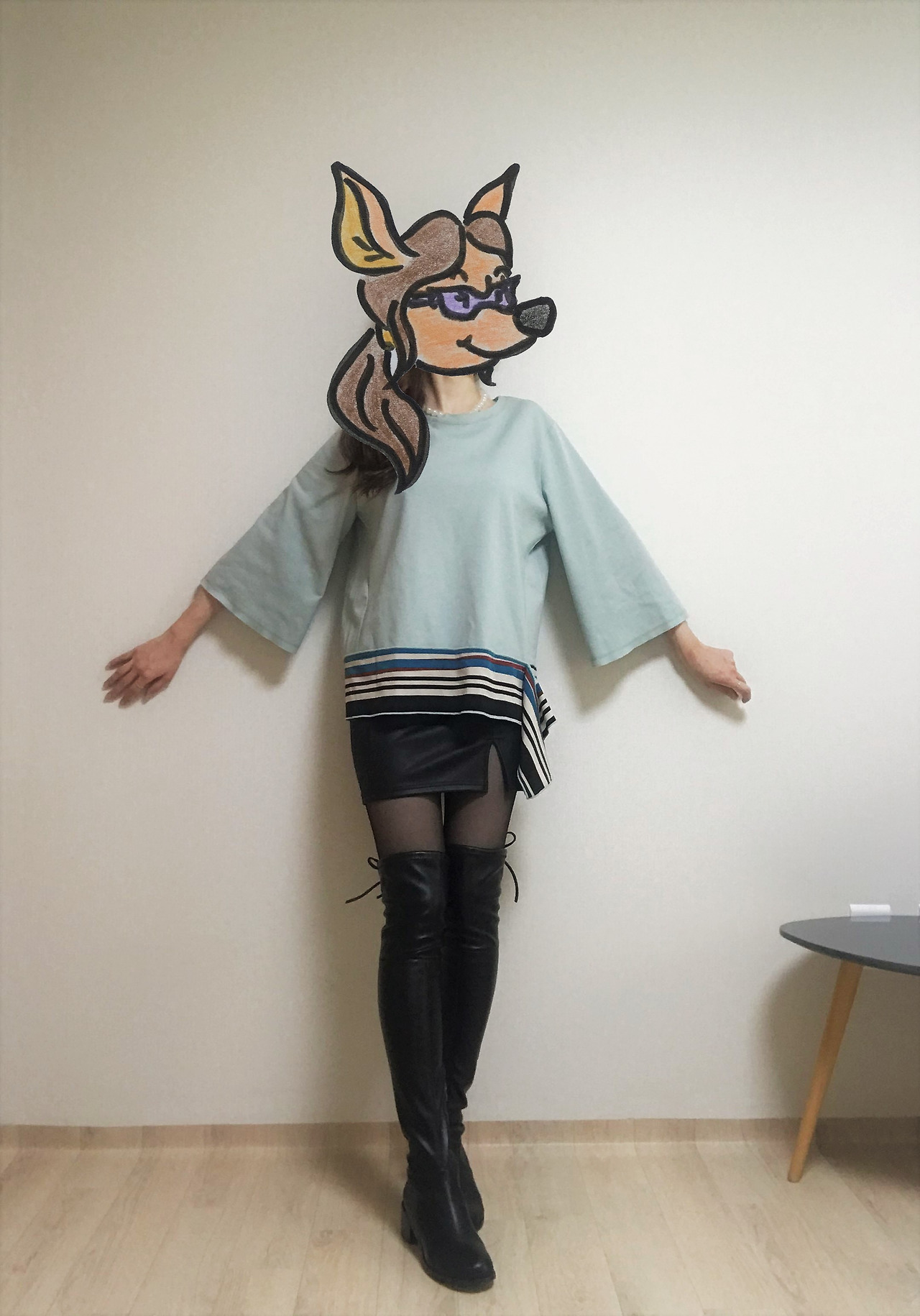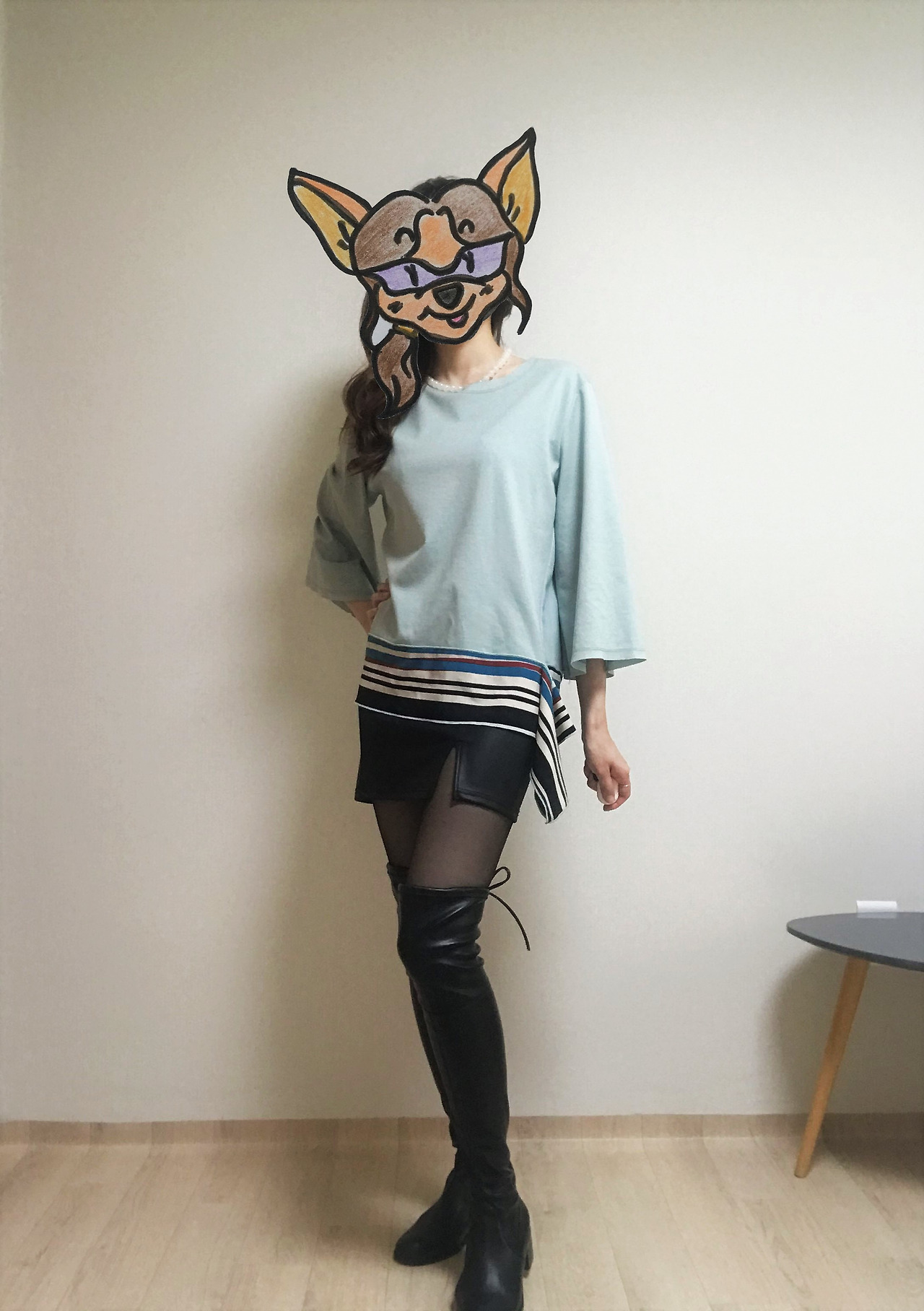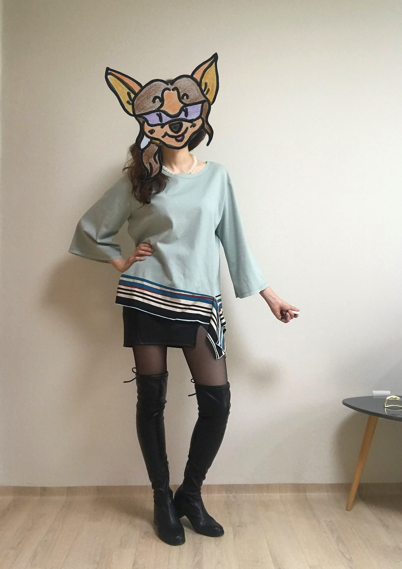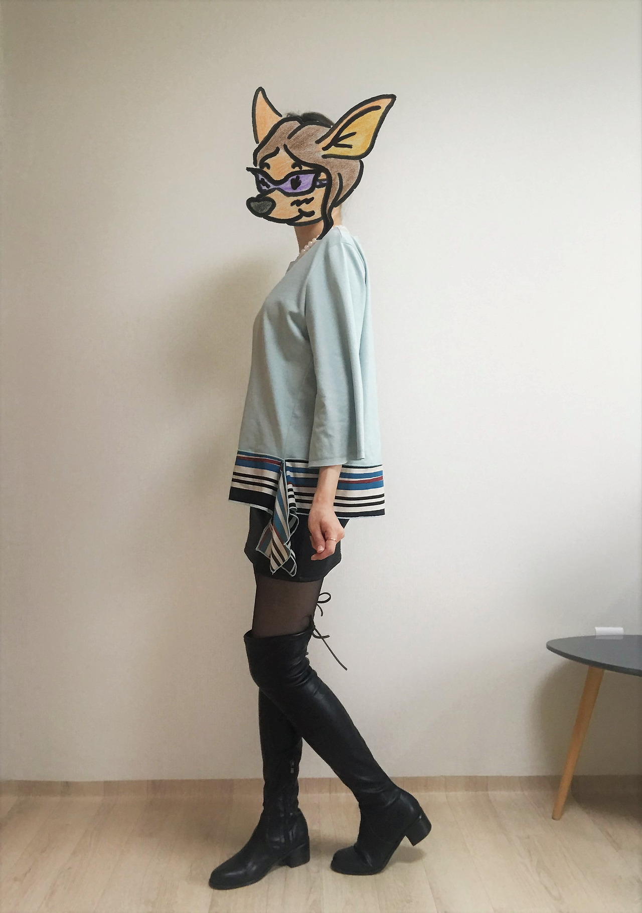 단순한 실루엣에 눈길을 끄는 색깔 배합으로 포인트를 준 디자인이 60년대 패션의 상징, 트위기의 '시프트 드레스'가 떠올리게 했다. 하지만 드레스로 입기엔 길이가 애매하니 같이 입을 만한 아이템을 고민한다. 트위기를 뮤즈로 삼는다면 역시 미니스커트가 가장 어울리겠지? 내 방 옷장을 뒤져 갖고 있던 미니스커트를 전부 꺼내 보았다. 단순한 라인의 가죽 미니스커트가 눈에 띄었다. 원피스였다면 무조건 플랫슈즈를 신는 게 정답인데, 워낙 바닥에 쿠션이 없는 신발을 잘 사지 않는 편이라 지금 이 조합에 어울리는 현실적인 대안은 무릎을 덮는 길이의 롱부츠가 최선이다.