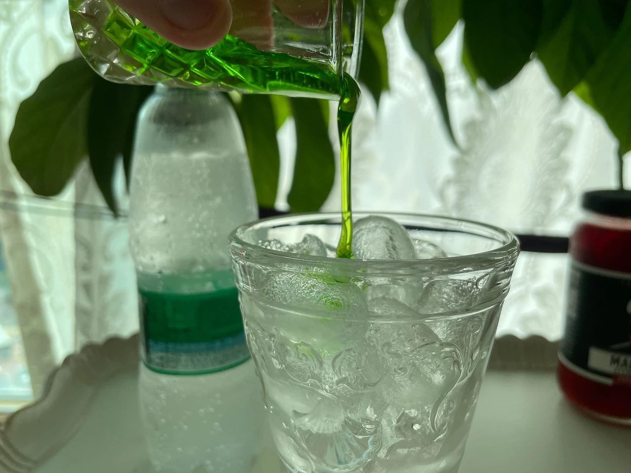2.얼음을 미리 채워주고, 메론시럽과 탄산수를 부은후, 골고루 저어준다.