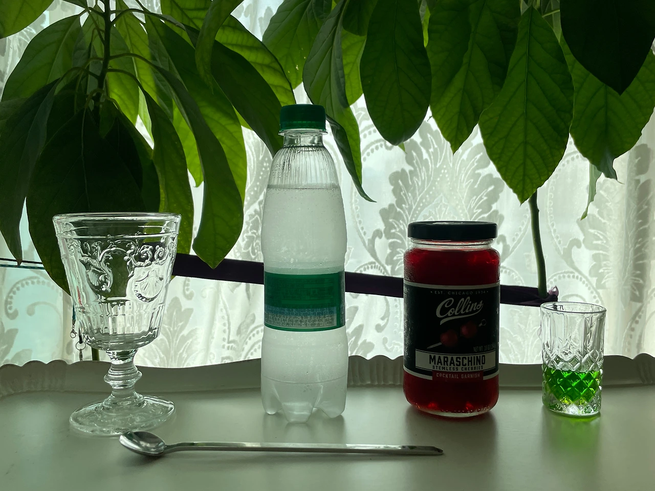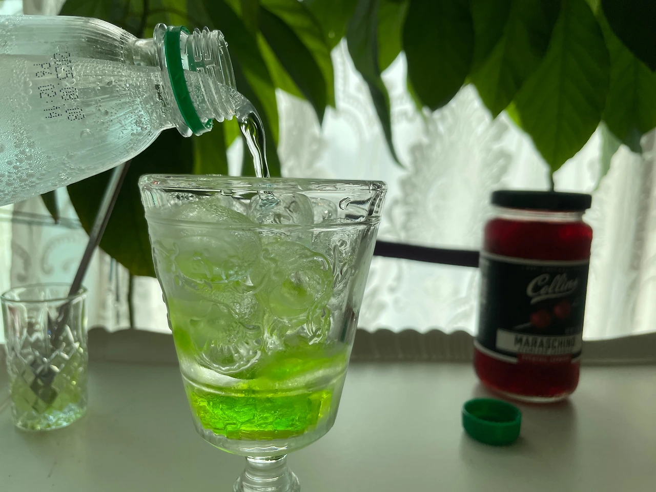 재료: 탄산수, 얼음, 메론시럽, 바닐라 아이스크림, 절인 체리