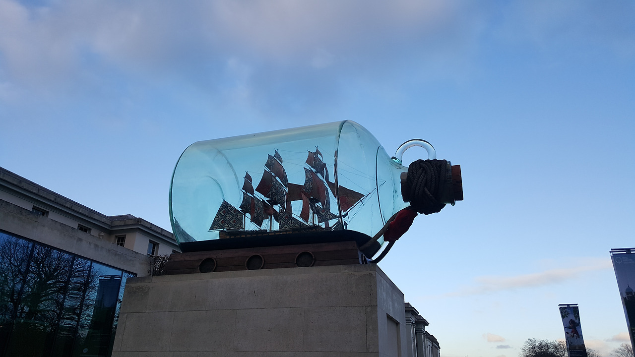 It stood from May 2010 till January 2012. The ship's 37 large sails were made of patterned textiles typical of African dress. They are used to show African identity and independence. The work considers the legacy of British colonialism and its expansion in trade and Empire. It now has a permanent home at the National Maritime Museum in Greenwich. 2010년 5월부터 2012년 1월까지 설치된 작품. 이 작품은 네 번째 좌대에 설치된 작품 중 최초의 흑인 예술가의 작품이라고 합니다. 유리병 안에 들어 있는 배의 돛은 아프리카 옷의 전형적 패턴의 직물로 만들어졌는데, 이는 아프라키의 정체성과 독립을 보여주고자 함입니다. 현재는 트라팔가 광장에서 그리니치 국립해양박물관으로 옮겨져 설치되어 있습니다.