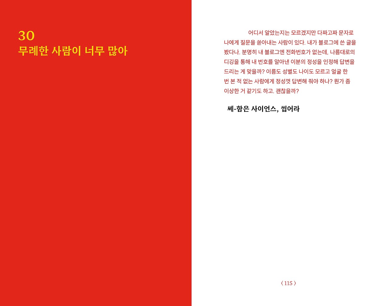 저 역시 동의했어요. “일을 하기 싫은데 어떻게 하죠?” 같은, 보통은 질문 하기에 너무 한심스러워서 하지 않으나 사실 우리 마음 한 켠에 늘 자리하는 질문도 다루는 만큼, 답변도 때로는 파격적일 필요가 있다는 생각이 들었거든요.