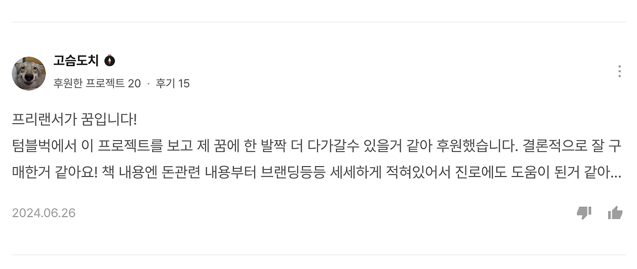 프리랜서 예언집은 그렇게 일하는 프리랜서가 만들었기에, 더 자신있게 보여줄 수 있는 책입니다. 1~3년차를 대상으로 했지만, 이미 4-5년차 쯤 만들었던 저 역시도 배울게 있었고요. 앞으로도 중요한 골자는 크게 변하지 않을 거 같아요. 상황이 바뀌니 좀 더 디테일한 답변이 필요할 뿐이죠. 앞으로도 그에 답변할 수 있도록, 지금 이 시기의 고민과 해답을 잘 기록해 두고 또 이야기 할 수 있는 제작자가 되겠습니다. 일단 지금은, 연초에 프리랜서 예언집을 잘 판매해 보고요. (웃음)