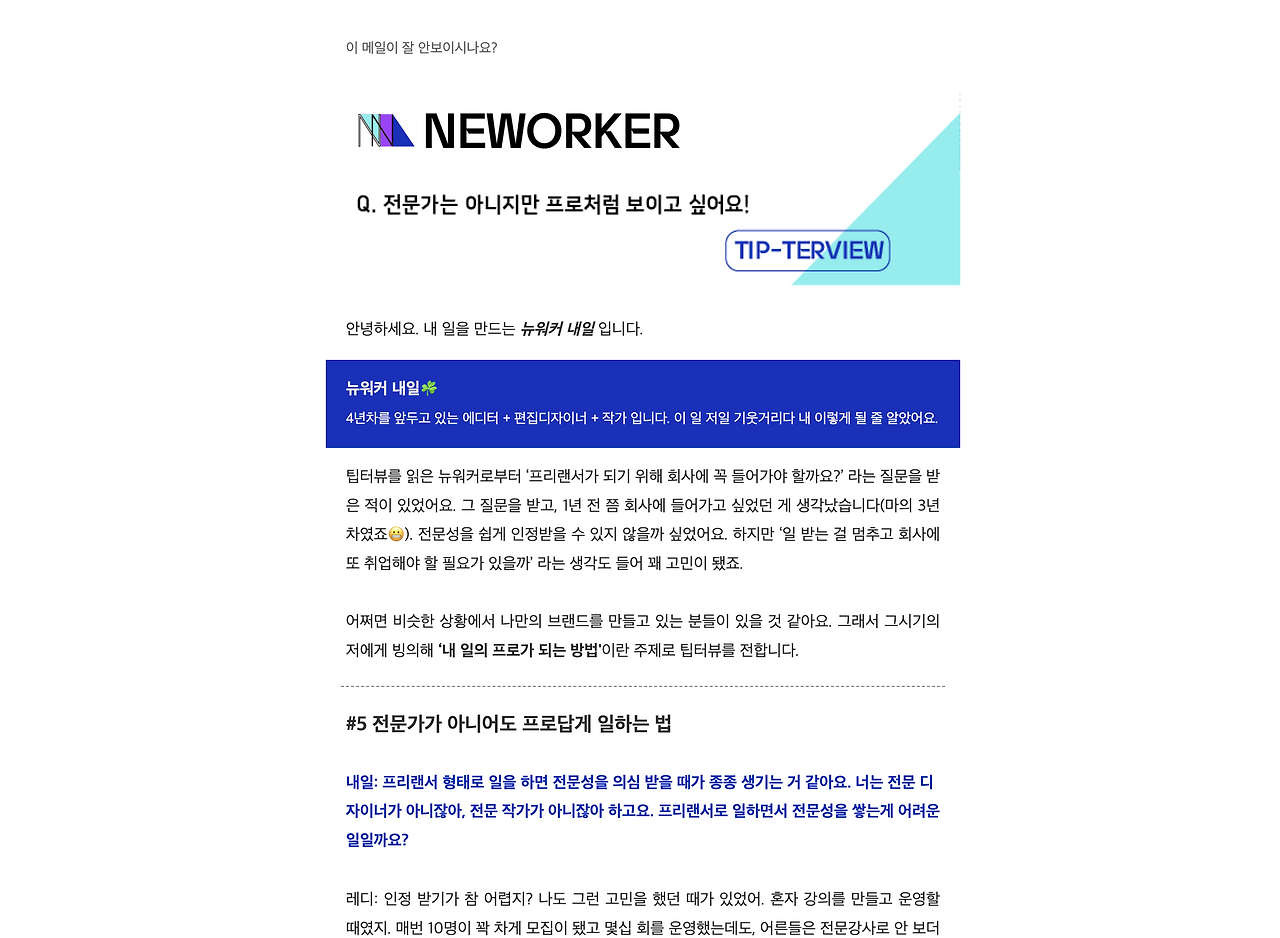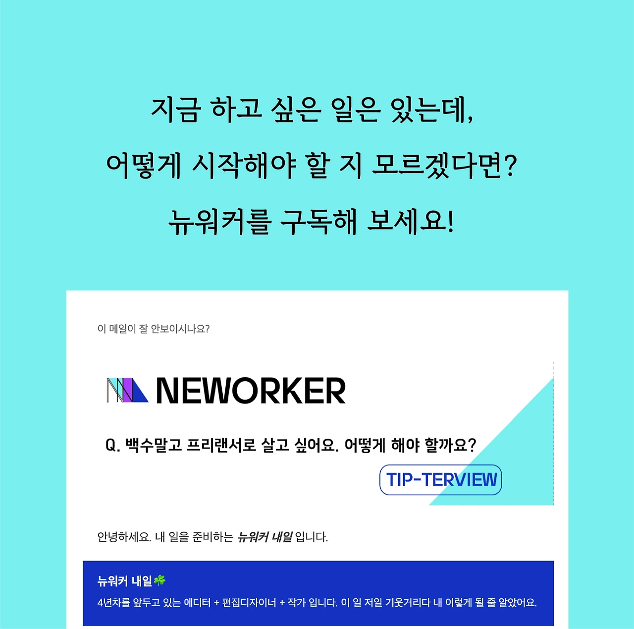 때는 2022년, 저와 인숙대표님은 함께 뉴스레터 "뉴워커"(클릭하면 아카이브 페이지로 이동)를 발행했습니다. 저는 격주로 대표님을 인터뷰 해서, 사이드 잡을 하시는 분들이나 프리랜서 또는 1인기업의 형태로 일하는 이들을 위한 팁터뷰를 연재했죠. 대표님도 동일한 타겟을 대상으로 본인이 얻은 인사이트를 격주로 연재했고요. 그렇게 돌아가면서 일요일 밤마다 뉴스레터를 보냈습니다.