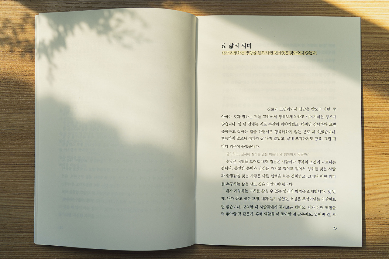 원고가 되었다면 다음은 디자인 단입니다. 사실 디자이너에게 맡기자는 이야기도 잠깐 했는데, 결국엔 제가 했어요. 사양 자체도 안 높고 일단 만들어서 좋은 반응이면 그때 더 잘 뽑아보자고 인숙쌤이 말씀하시더라고요. 그럼 일단은 내가 할 수 있는 건 다 해드리고 그때 디자이너에게 맡길지 말지 생각해도 될 것 같았어요. 어쨌든 이렇게 제게는 포트폴리오가 생겼습니다. 야호.