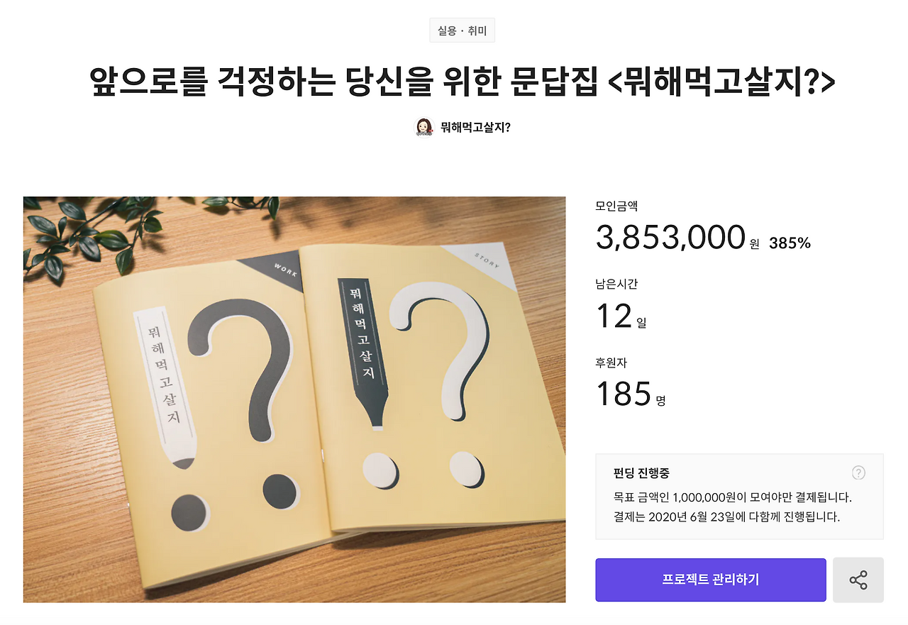 음 일단 이정도를 풀 수 있을 것 같습니다. 저는 이 일을 계기로, '나는 앞으로도 콘텐츠를 만들거야!' 라는 생각을 했답니다. 꽤 길었던 시간이었지만 이젠 정말 제 이름 달고 결과물로 나오는 일이 좋더라고요. 그게 글이든 글이 아니었든. 다음에는 제 책을 펀딩할까 하고 있습니다. 사실 이렇게 드라마틱 하진 않을테지만, 세 번째는 더 잘 할 것 같기도 하고요. 히히 괜히 용기가 났습니다.