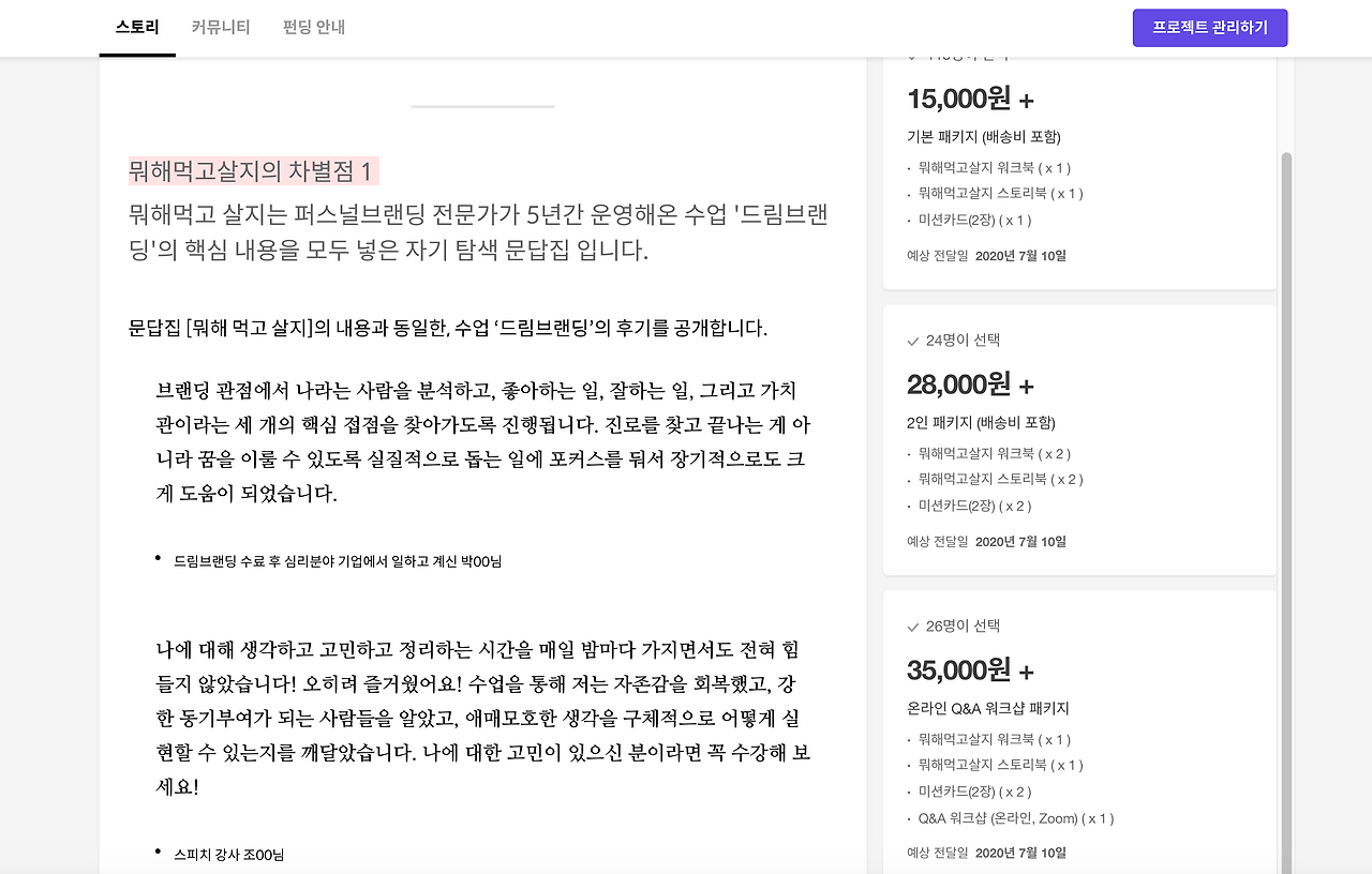 가제본 책, 펀딩 제목, 메인 카피, 서브 홍보 카피들,