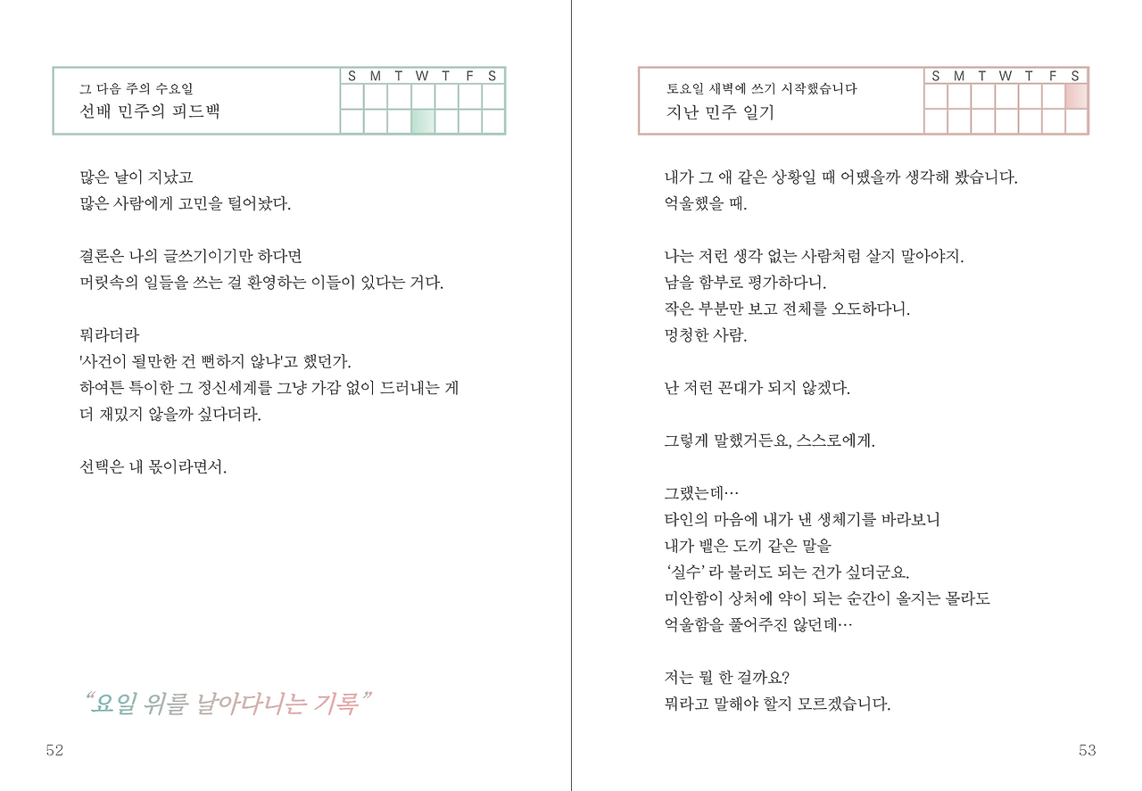 실제로 책을 읽으면서 어디가 지난주고, 어디가 이번 주인지 모르겠어서 좀 헷갈렸다는 얘기를 많이 들었어요. 제가 신경을 쓴다고 했는데도... 애초에 이렇게 매기고 받는 형식의 책이 많진 않고 사람들이 많이 읽어보지 않았으니까 더욱 구성의 통일을 해주었어야 했죠. 후회가 남는 부분입니다.