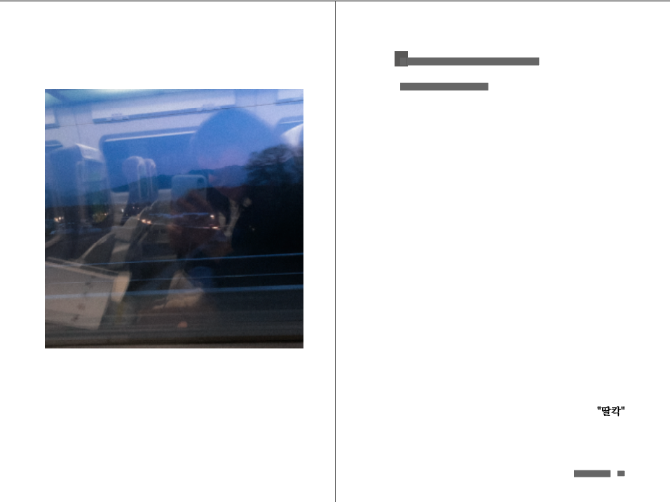 그건 바로 지난민주일기를 만들때 제가 날짜 순서대로 실었기 때문이죠. 이 페이지에선 너무 밝고 그다음 장에서는 너무 진지하고 어느날은 너무 막 자책하고 그러다가 막 웃기고 앉아있고. 그래서 나중에 읽어보니까 민망스러웠습니다. 저는 제 일기장인데도, '어우... 야... 너무... 좀 종잡을 수가 없다. 캐릭터가 뚜렷하지 않은 것 같다.'이런 생각이 들더라고요. 그래서 목적을 가지고 흐름을 좀 만들어내긴 해야겠다고 생각했죠. 그래서 집필할 때는 '차분하게' '가볍게', '감성'을 '돌아다니는' 느낌을 잃지 않으려고 했고. 원고를 배열하는 과정에서도 그 부분이 전달될 수 있게 노력을 했던 것 같습니다.