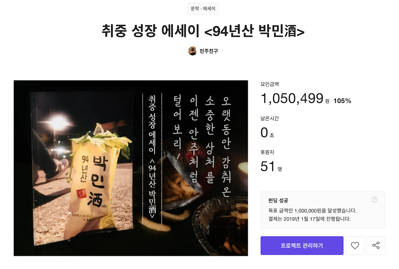그럼에도 만약 굿즈가 없이 펀딩을 받고 싶다면 펀딩 달성 목표를 정말 낮게 잡을 거예요. 제가 이미 94년산 박민주를 할 때 단권의 책으로 승부하는 무모한 짓을 해 본 적이 있기 때문이죠. 그때 다른 분들 펀딩 내용도 수도없이 봤는데, 아주 반짝반짝 빛나는 예쁜 굿즈들과 함께 책을 사진 찍은 게 많더라고요. 제가 돈을 가진 소비자 입장이더라도, 이걸 더 사고 싶을 것 같았습니다.